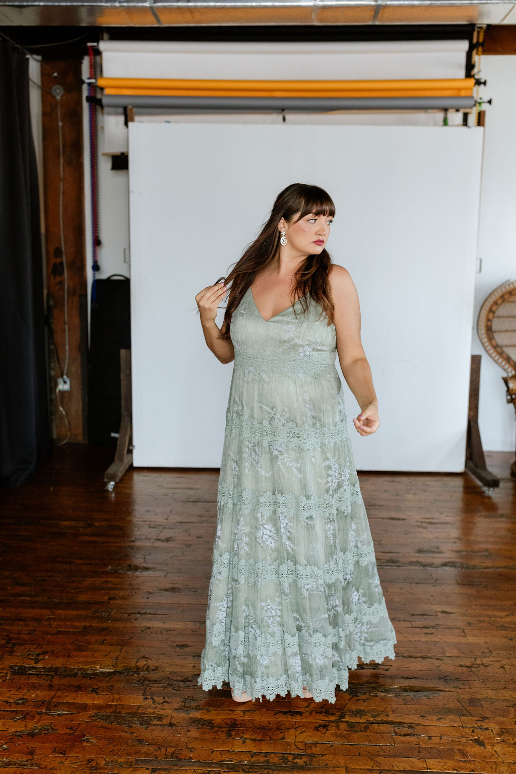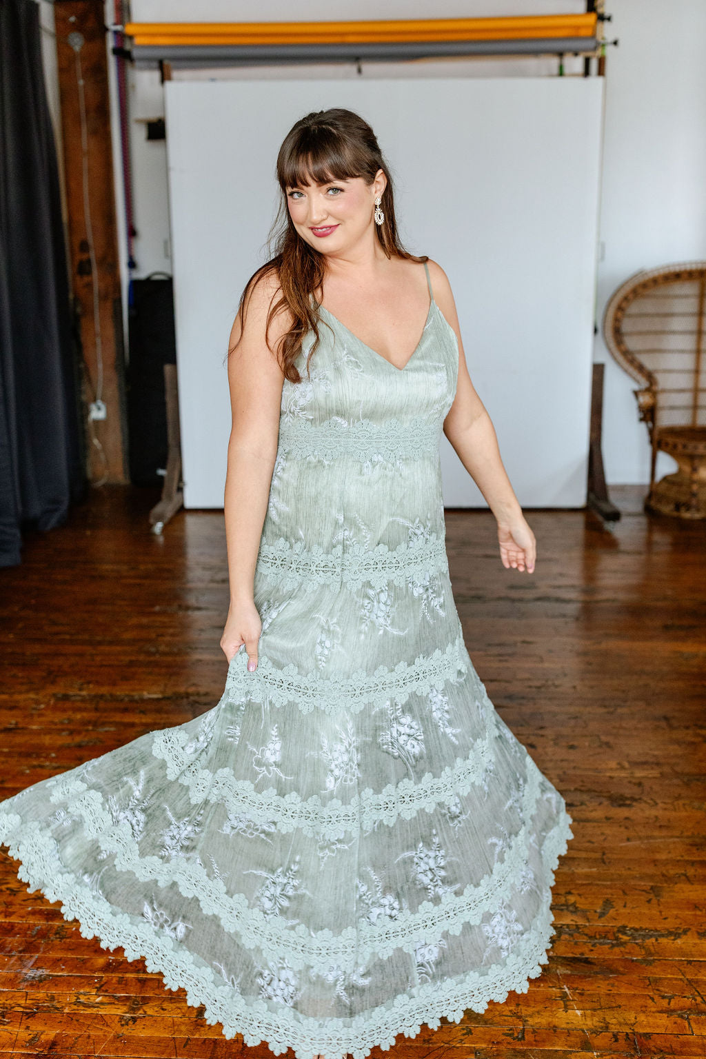 Silk floral printed dress with lace details. V-neck with adjustable spaghetti straps, empire bodice, tiered a-line skirt with lace appliqué, fully lined, hidden side zipper.