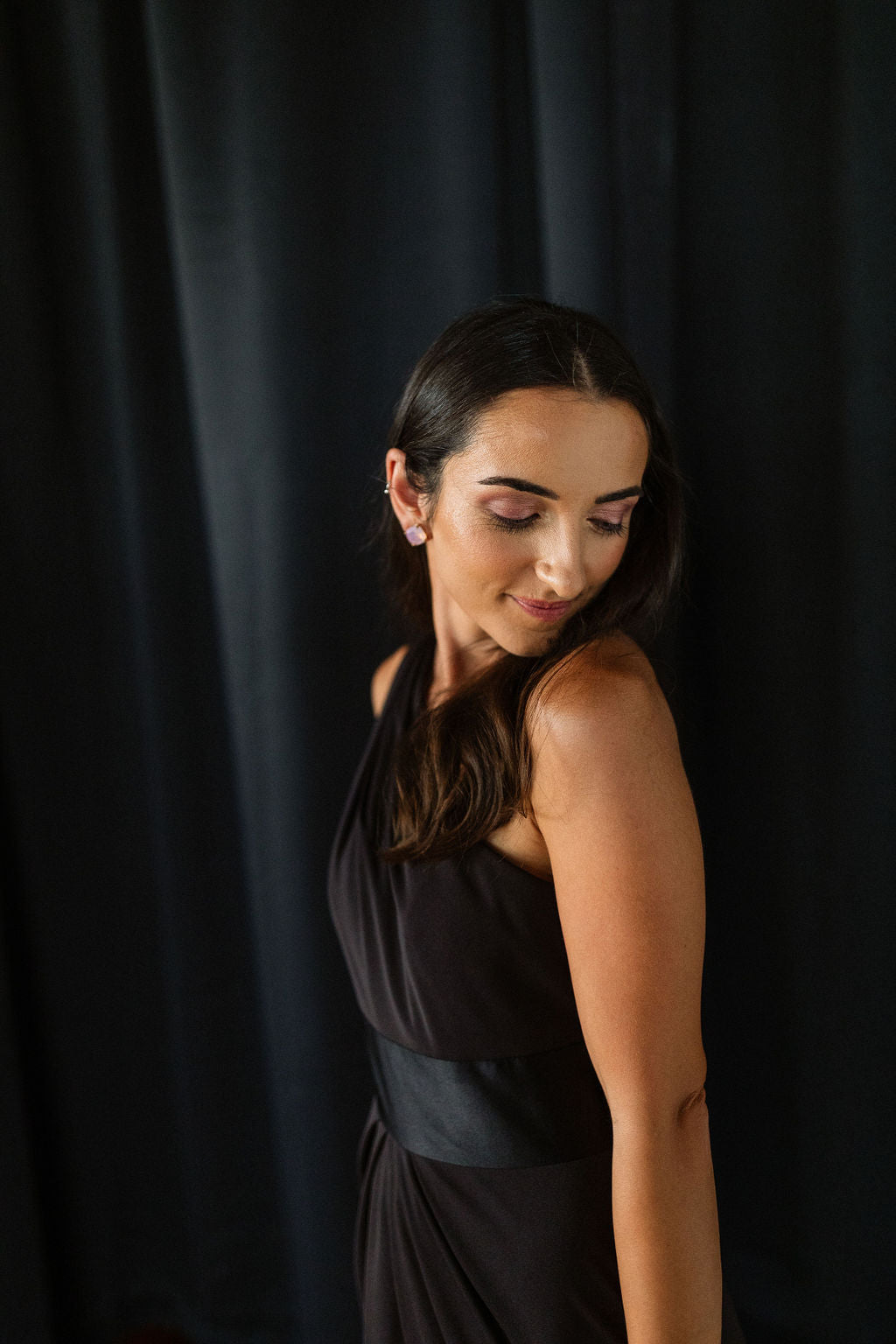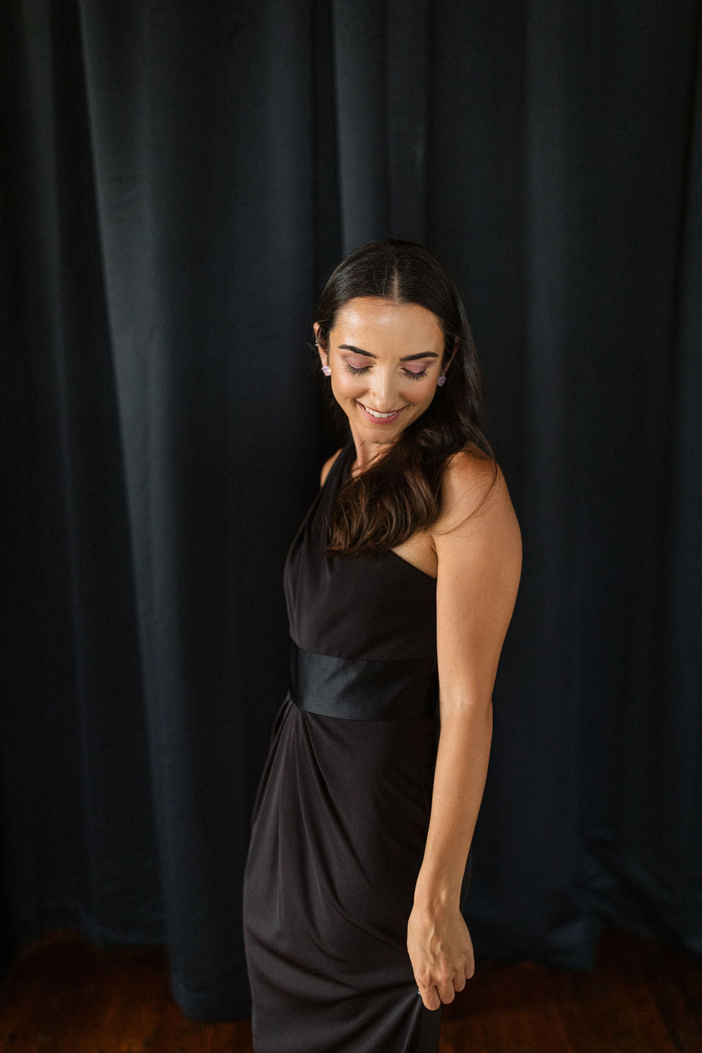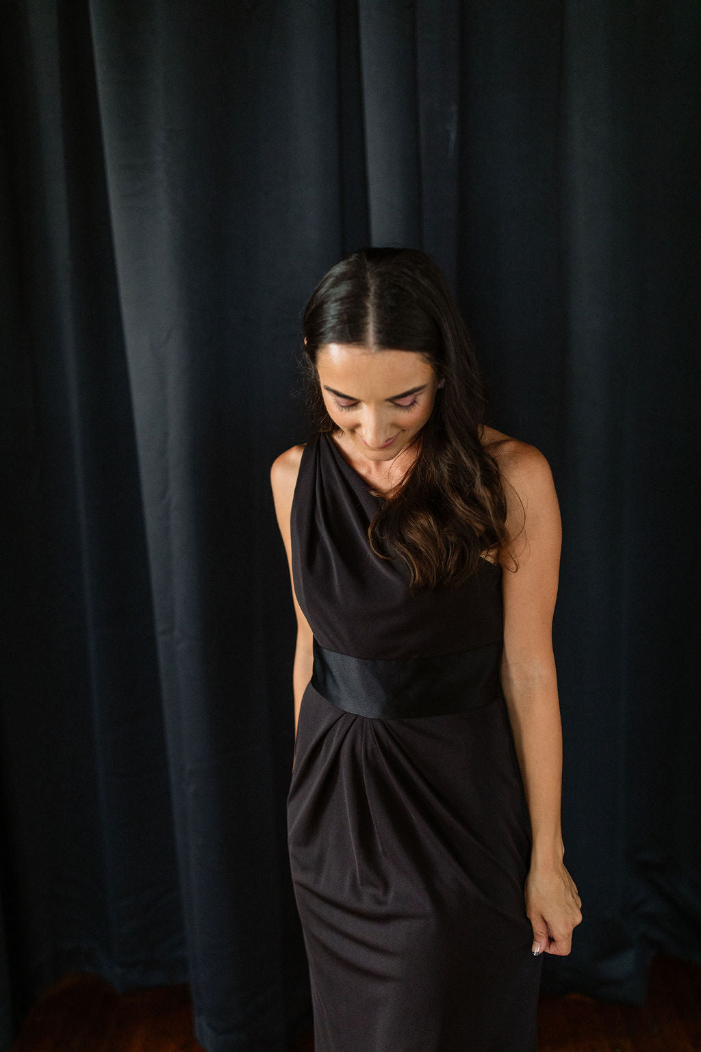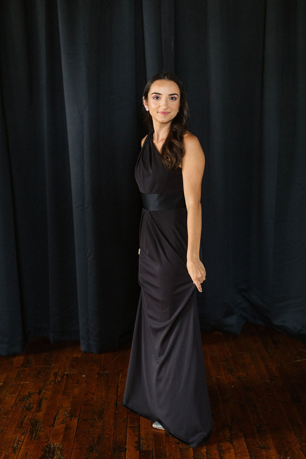 Crepe one shoulder (right) gown, empire bodice, 3" satin waistband, strappy open back, draping detail at front of column skirt.