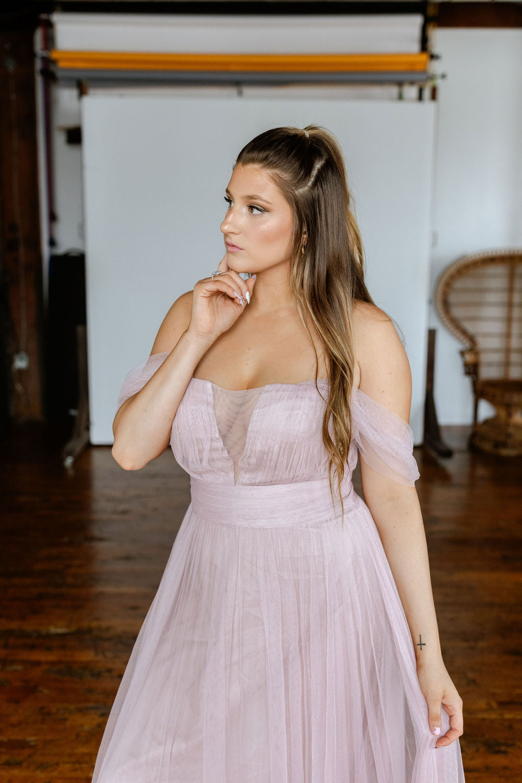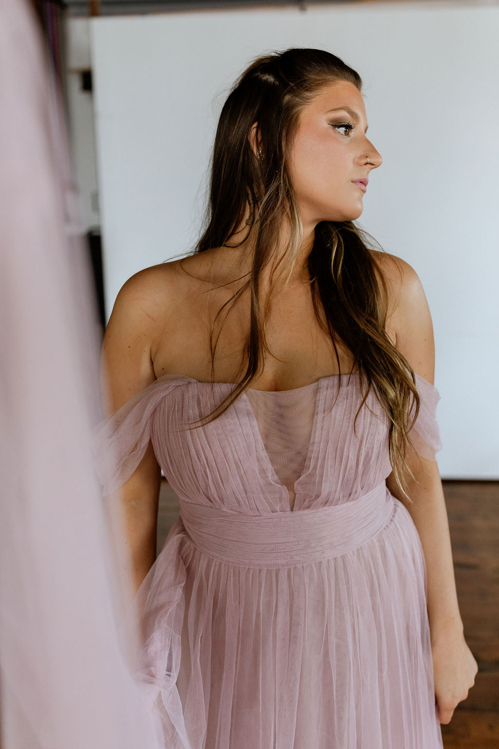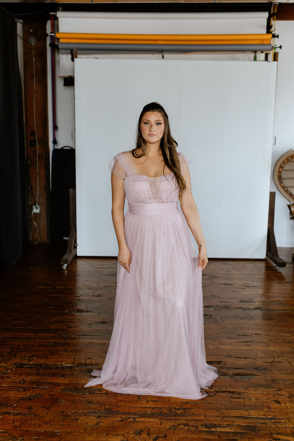 Tulle pleated empire boned bodice with deep v notch at center front, adjustable/optional spaghetti straps, off-shoulder tulle sleeves, 2.5" pleated tulled waistband, gathered a-line skirt, fully lined