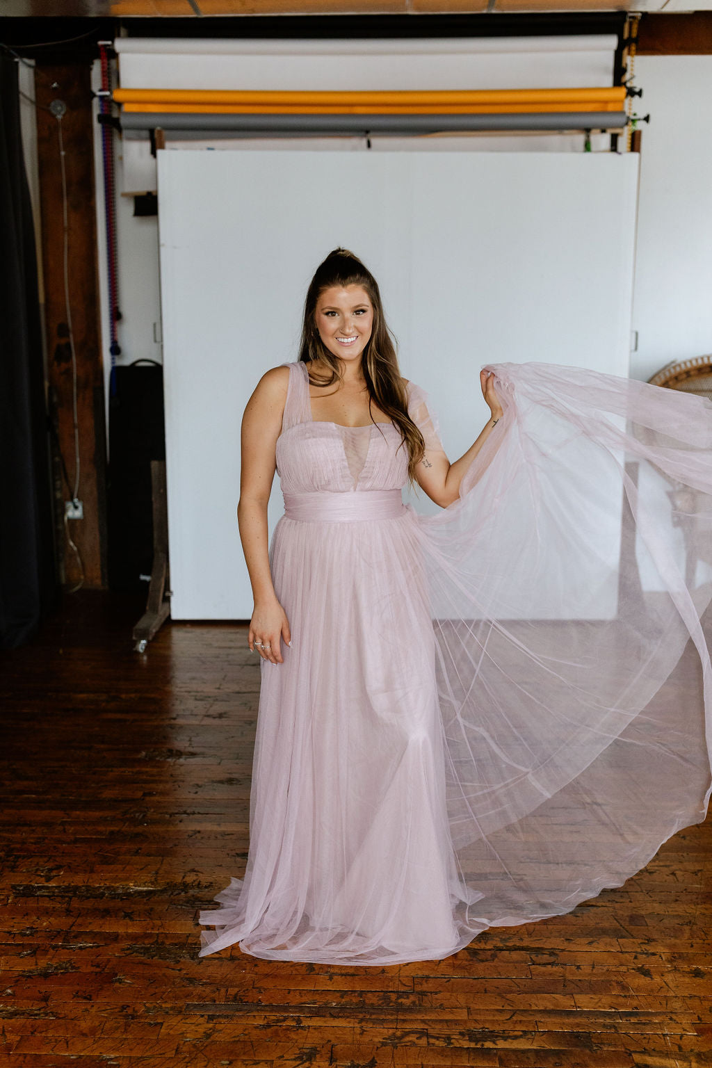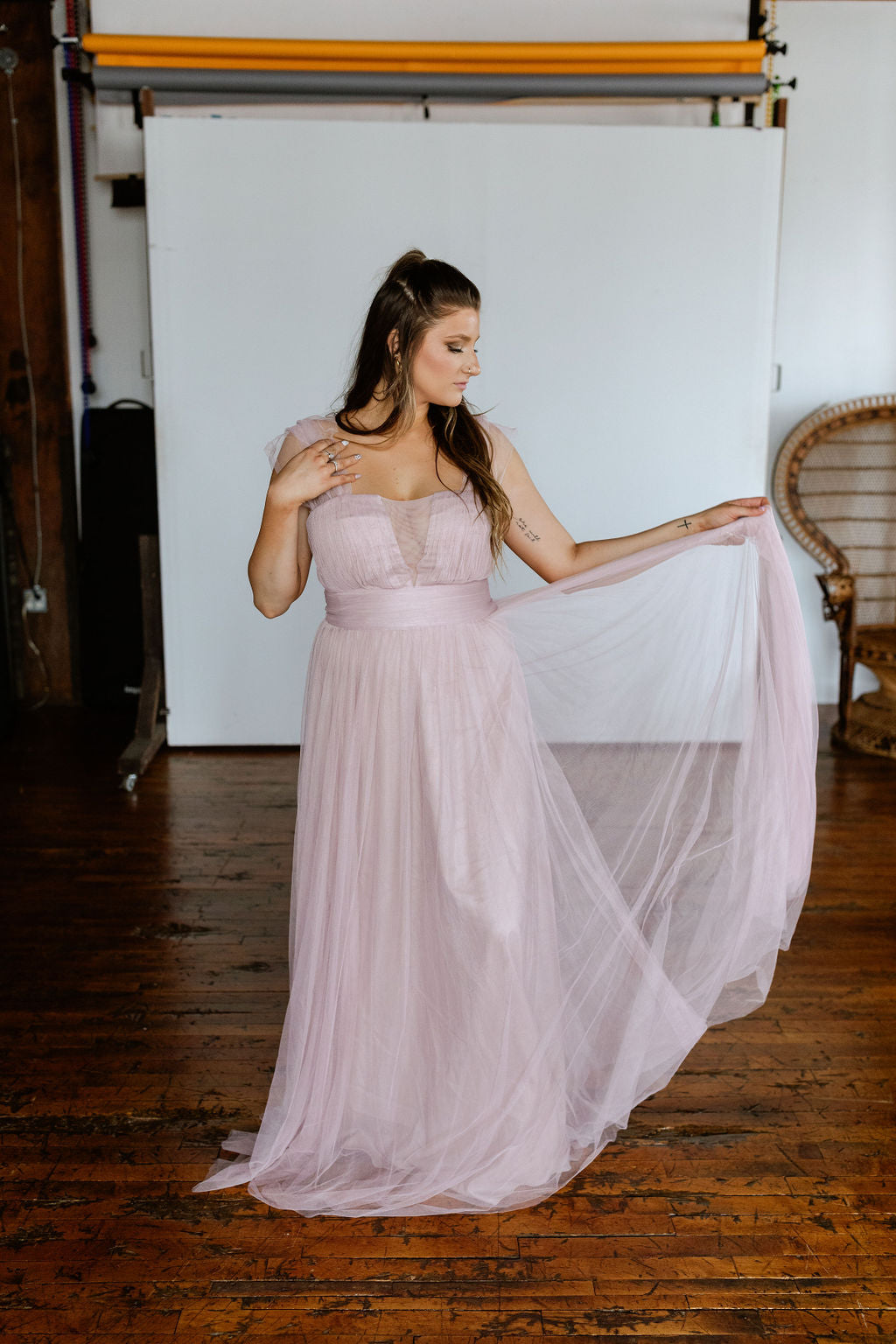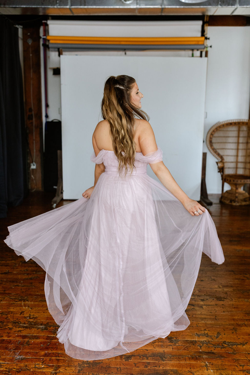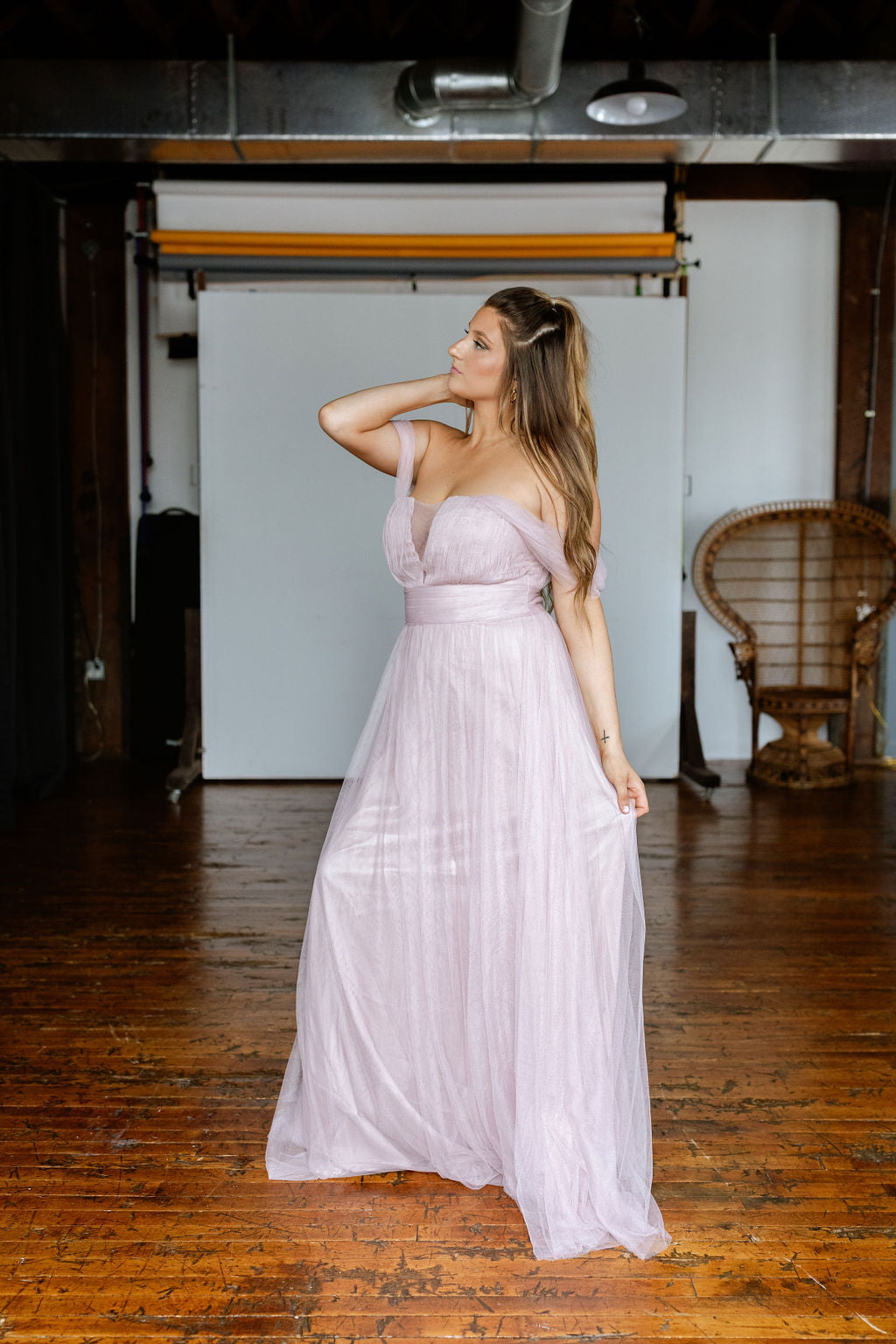 Tulle pleated empire boned bodice with deep v notch at center front, adjustable/optional spaghetti straps, off-shoulder tulle sleeves, 2.5" pleated tulled waistband, gathered a-line skirt, fully lined