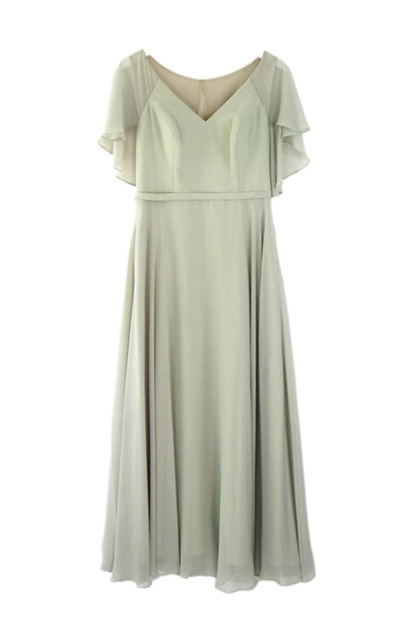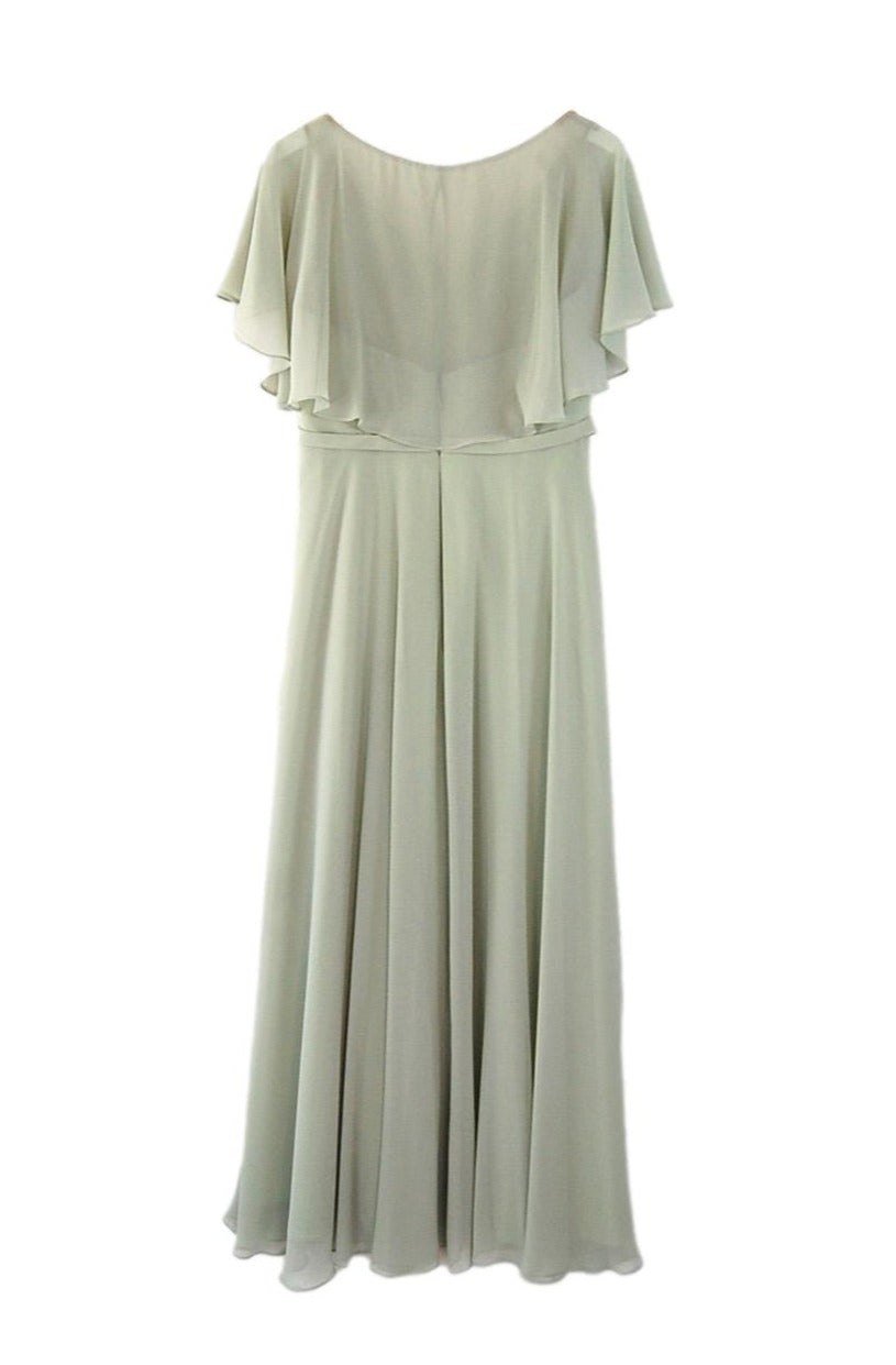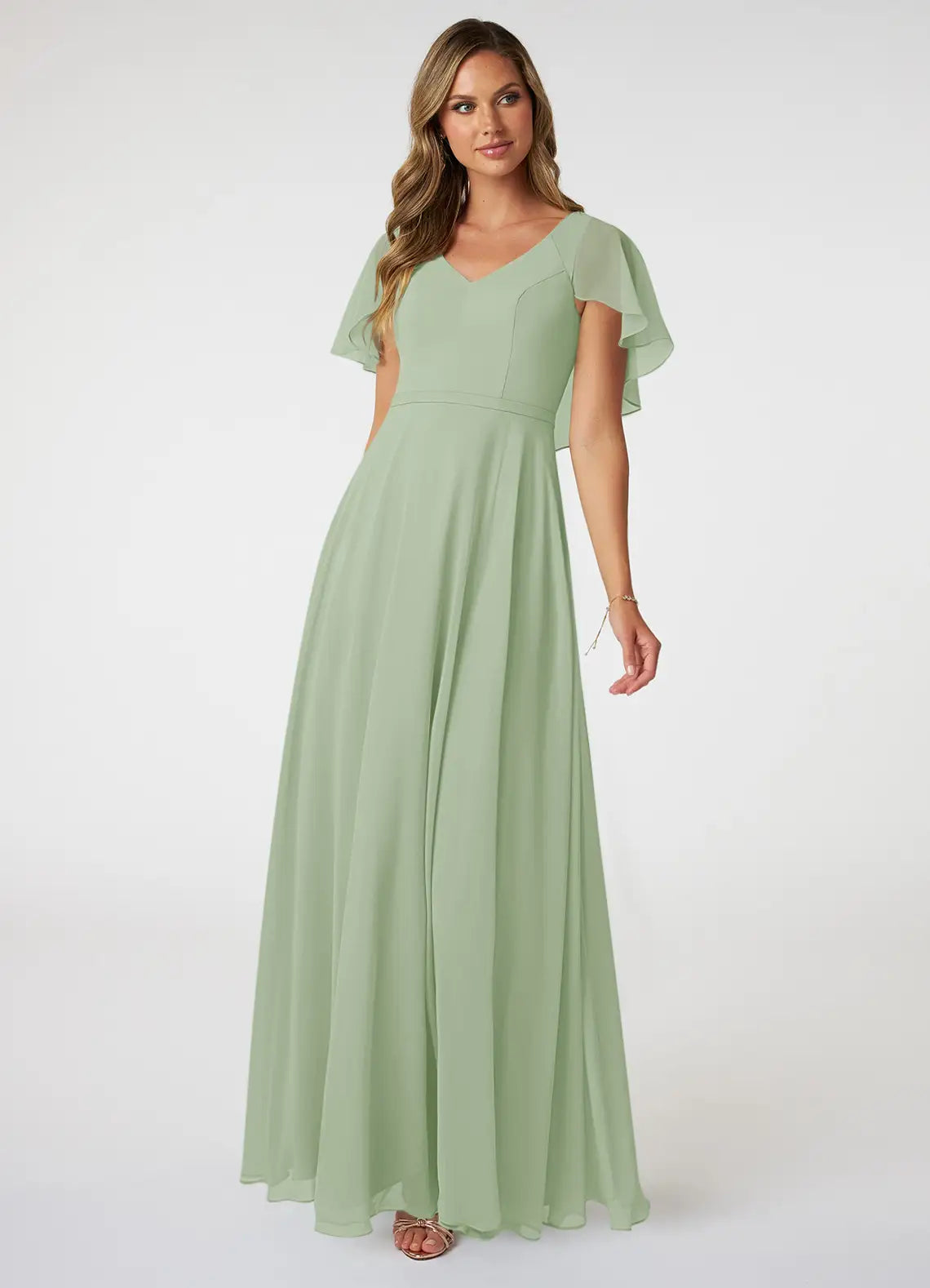 Extended empire blouson bodice, spaghetti straps, a-line skirt, side seam pockets.