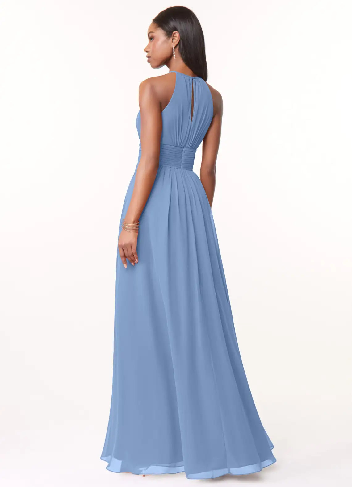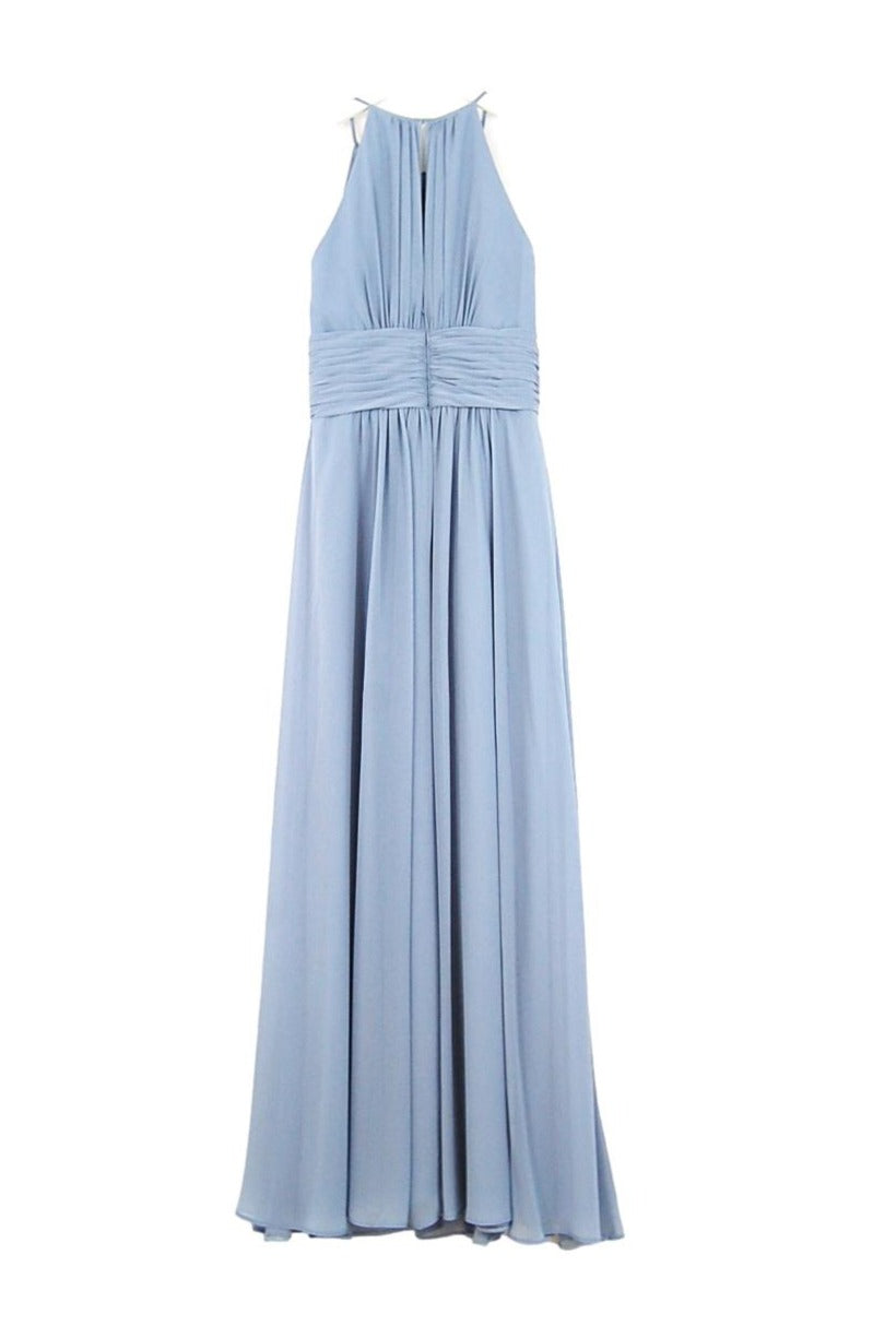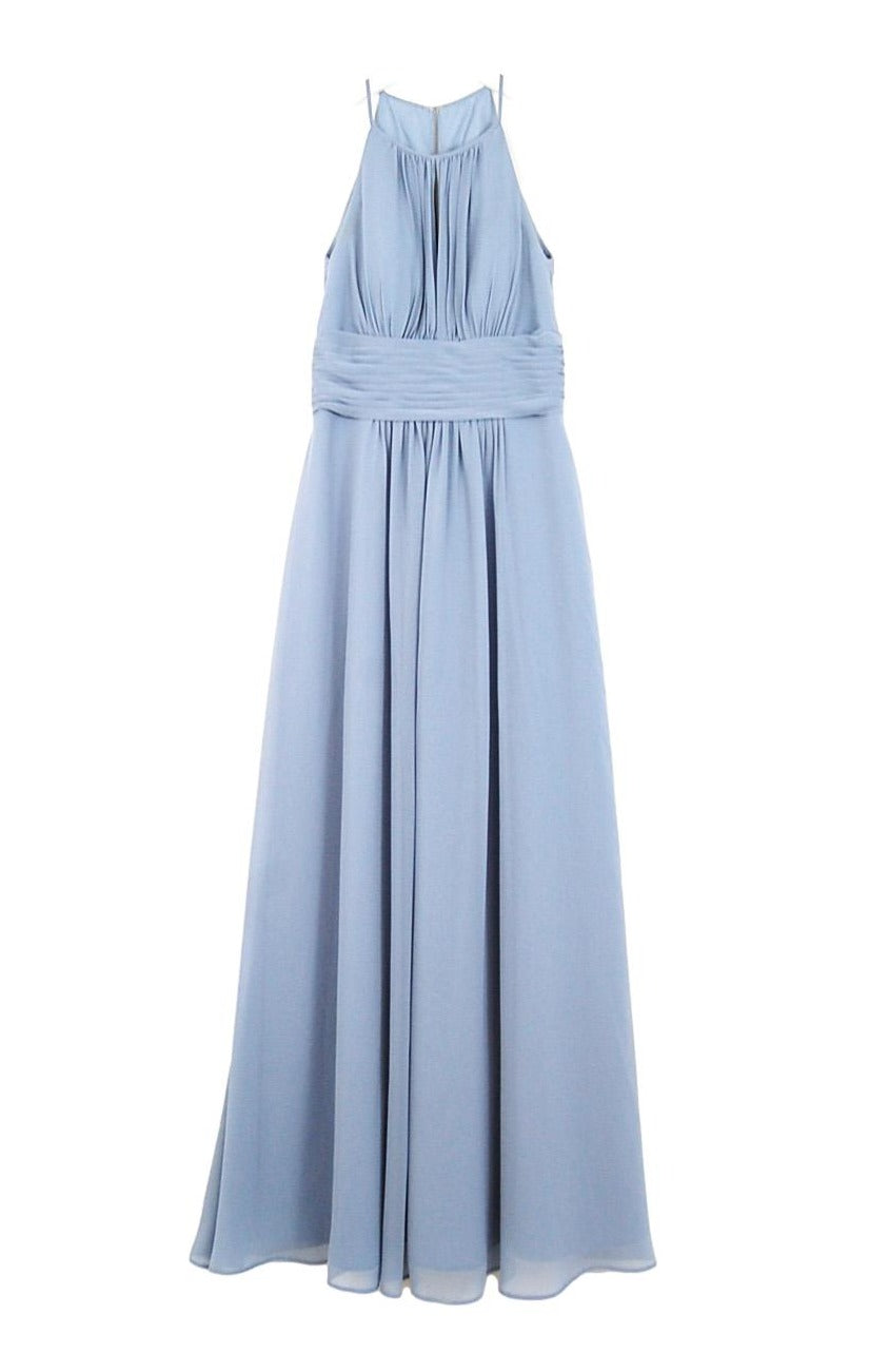 Chiffon high halter neckline, extended empire bodice with gathers at bust, built-in bust padding, gathers at neckline and bust, 4" wide pleated waistband, a-line skirt with gathers at center front and center back.