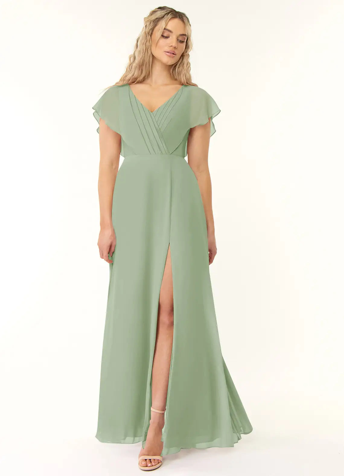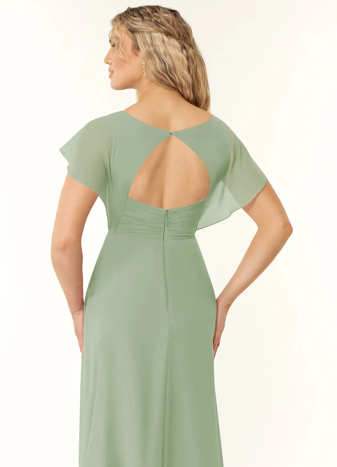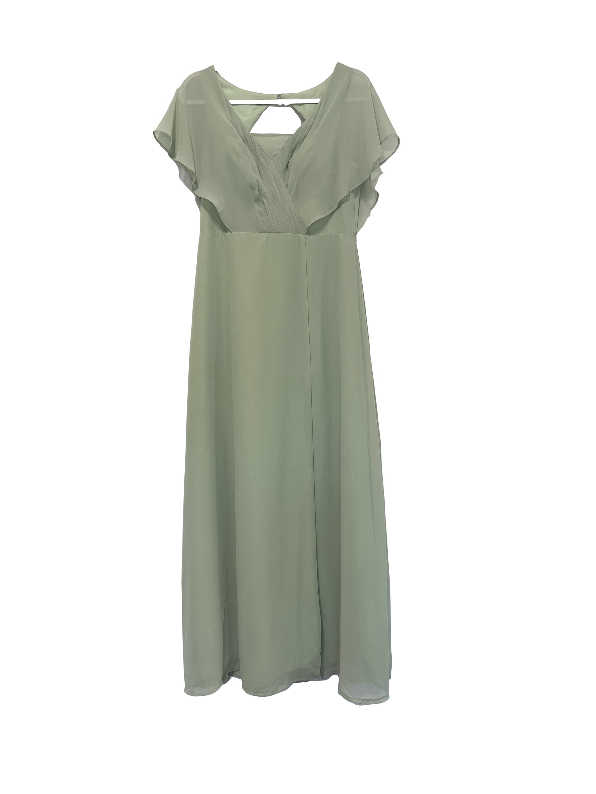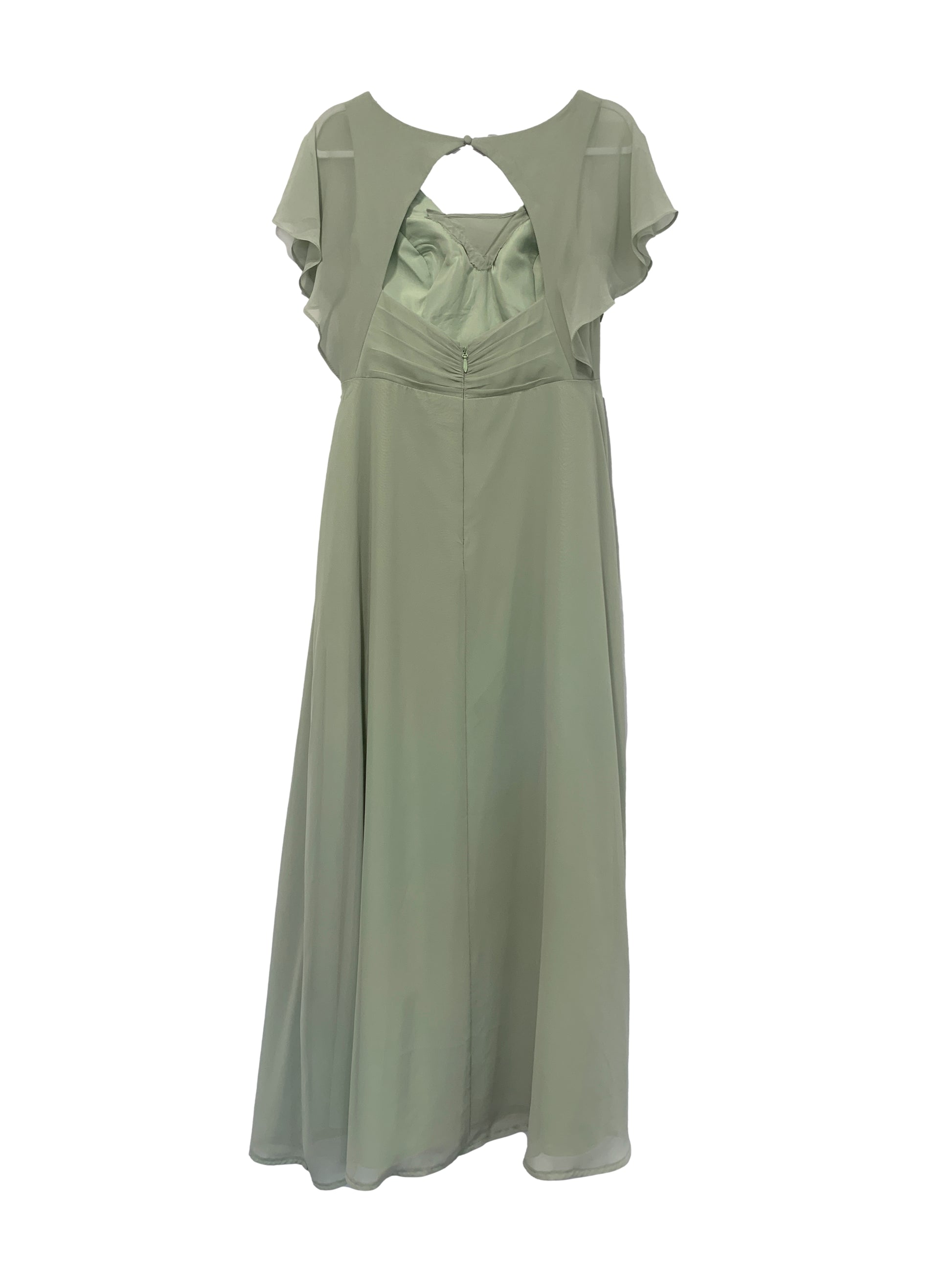 Draped, pleated bodice with built in padding, boning, and flutter sleeves. Open back with keyhole and button at top back neck. A-line skirt with thigh-high slit at left leg.