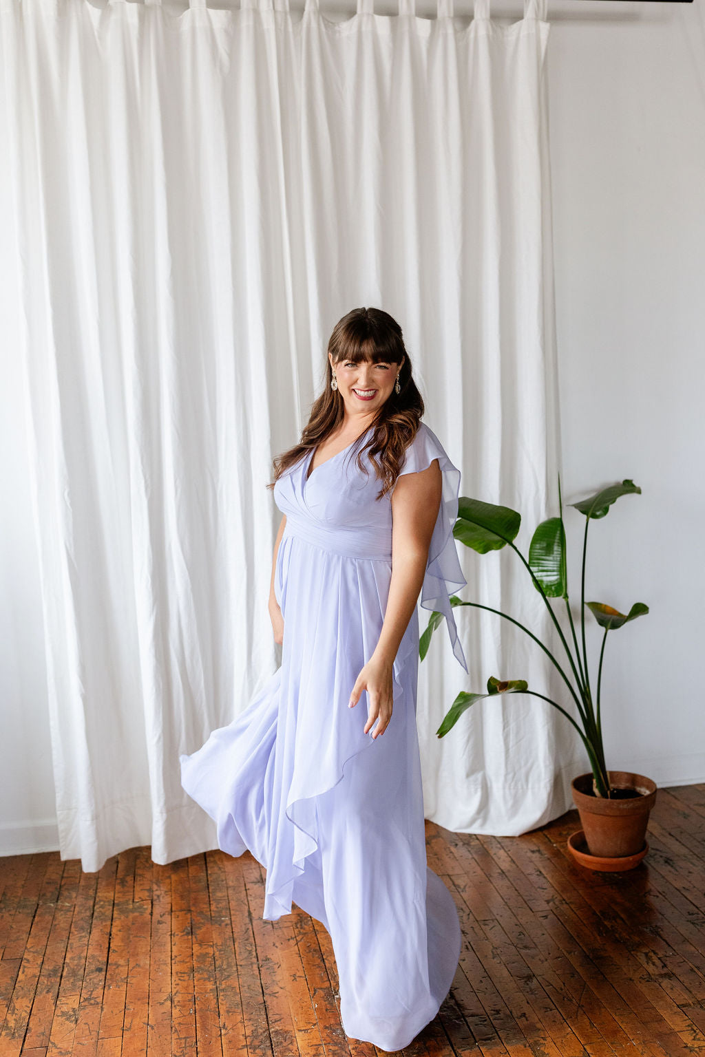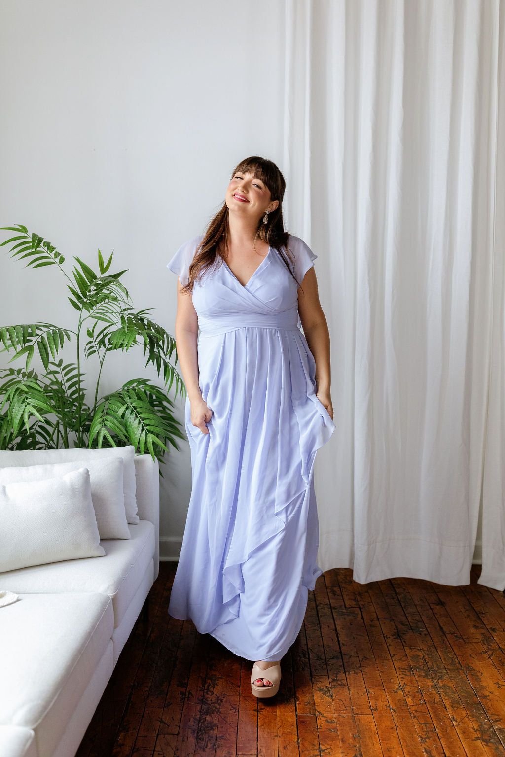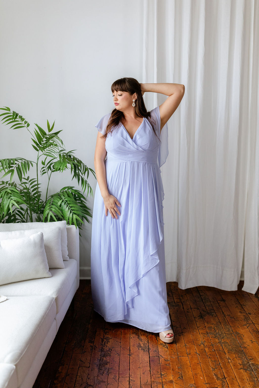 Chiffon empire bodice with built-in padding at bust, v-neck surplice neckline, flutter sleeves cascade down back, open back with tie at back neck, a-line skirt with faux wrap flounce at front