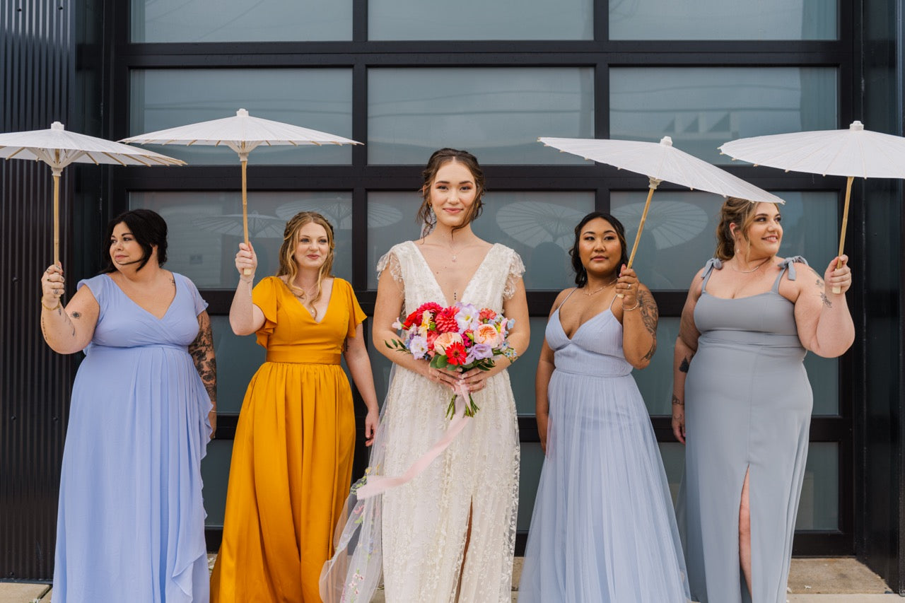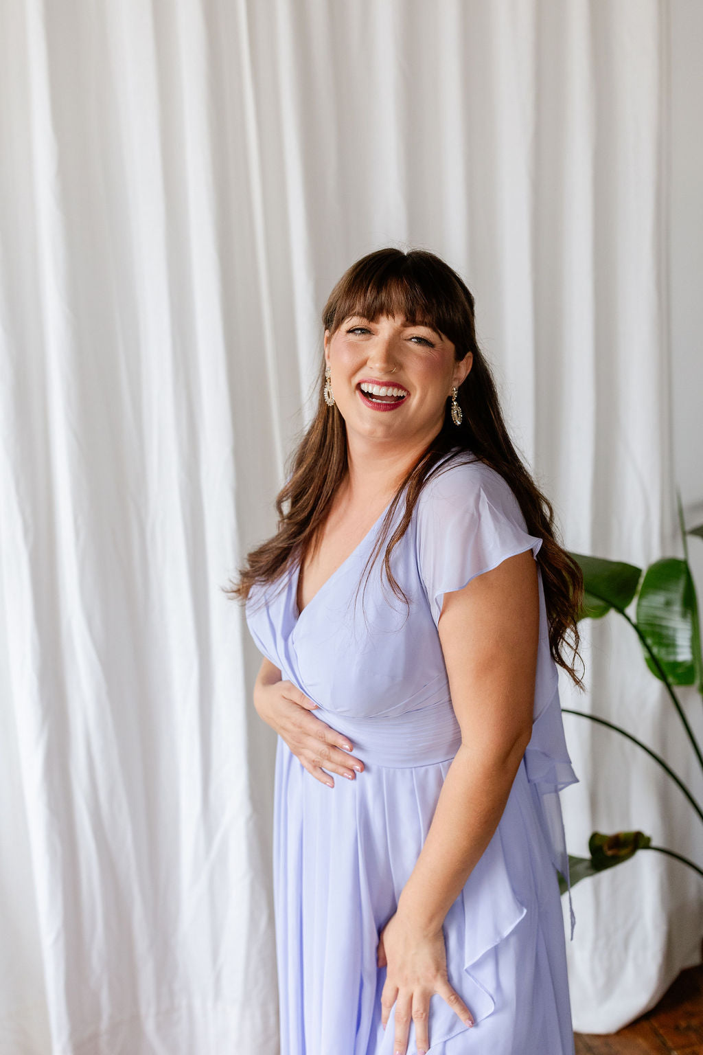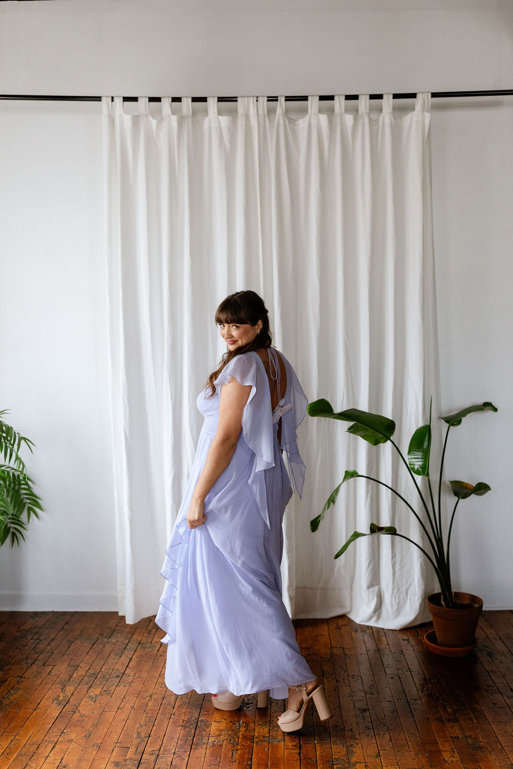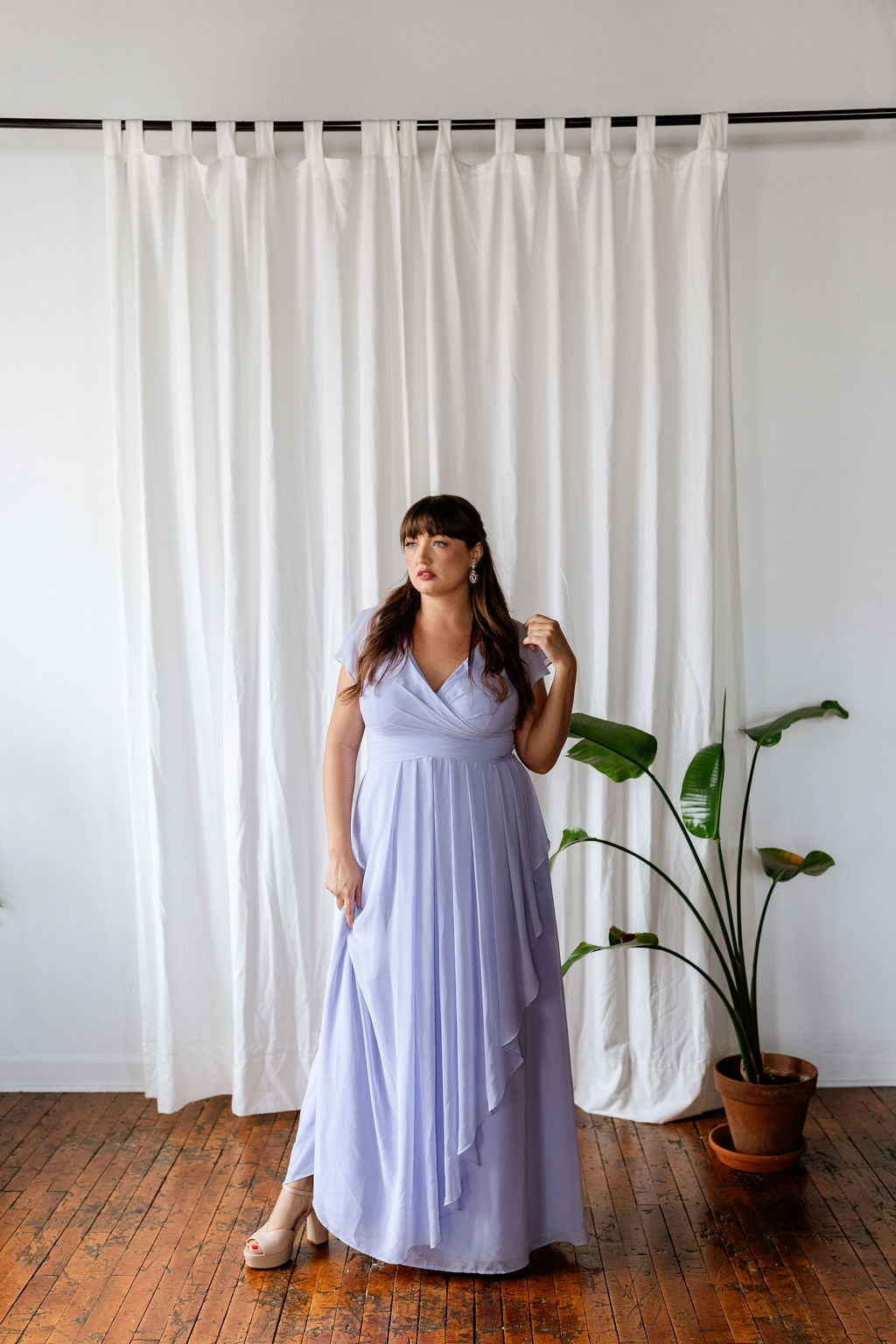 Chiffon empire bodice with built-in padding at bust, v-neck surplice neckline, flutter sleeves cascade down back, open back with tie at back neck, a-line skirt with faux wrap flounce at front