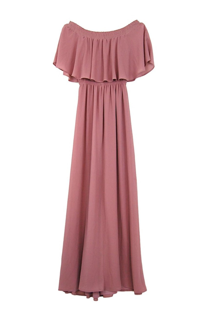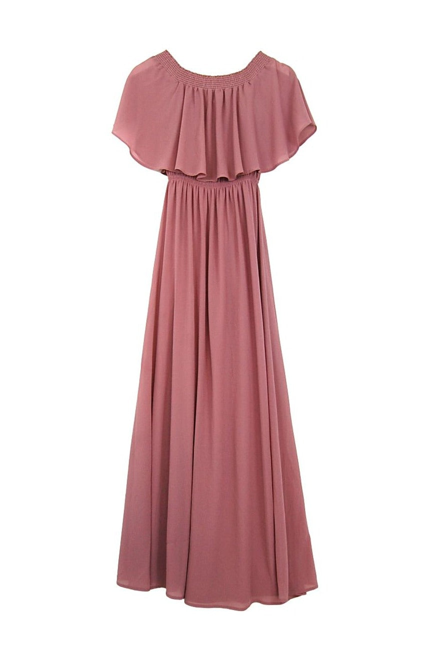 Maternity-friendly style ~ chiffon elasticized wide boat neckline, off-shoulder option, elasticized waist, a-line skirt