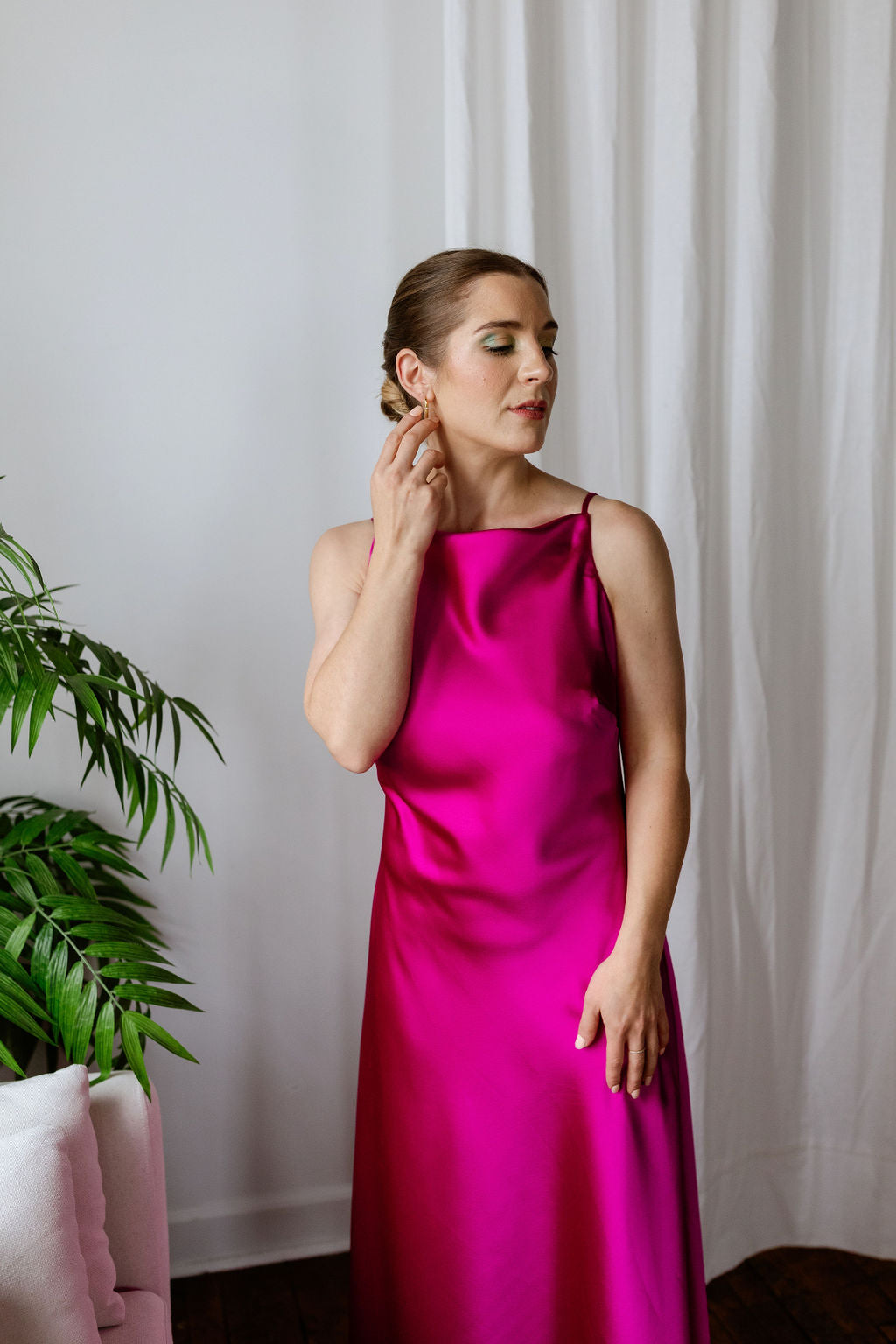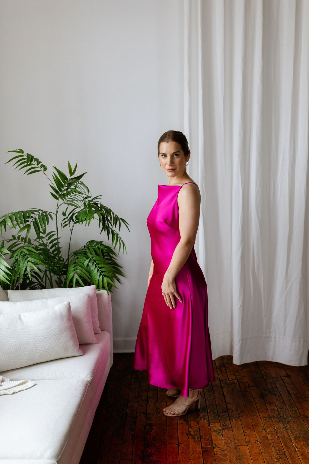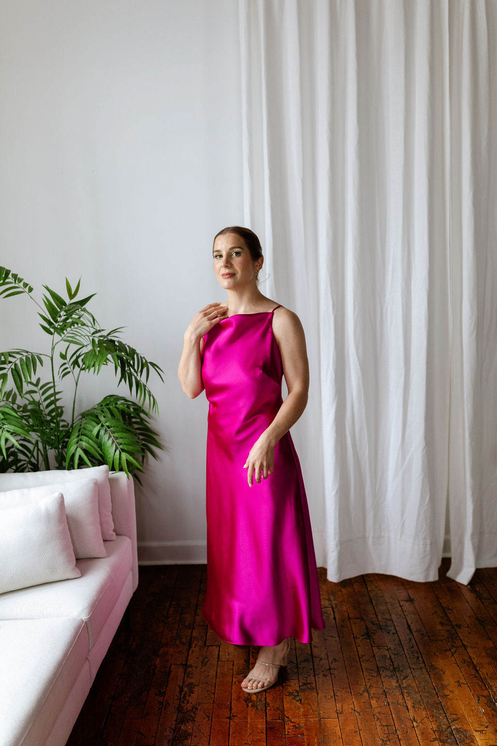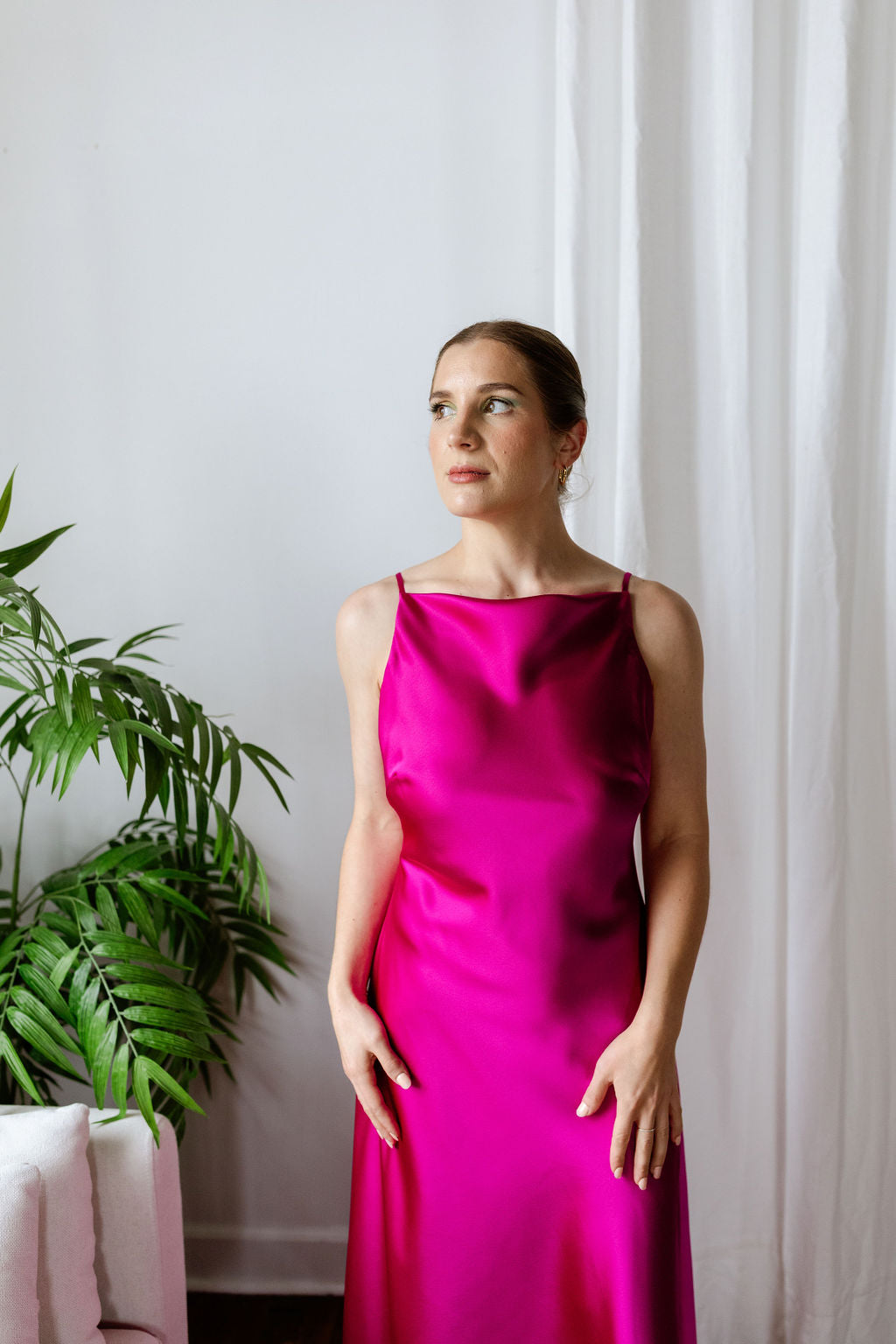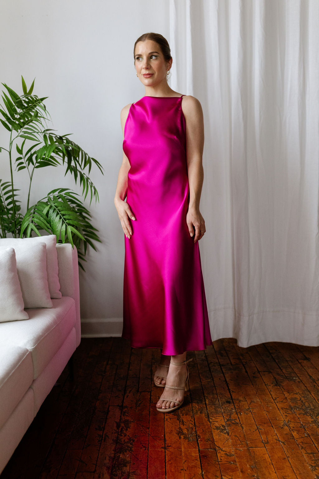 Fluid satin square neck with slight draped cowl, spaghetti straps, natural waist, open back, midi / tea length flare skirt