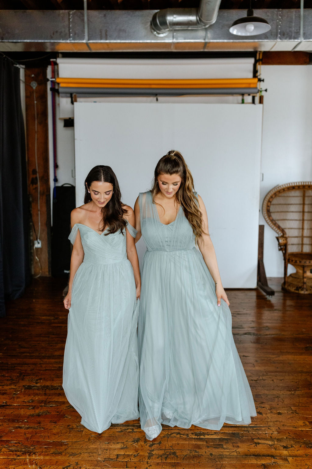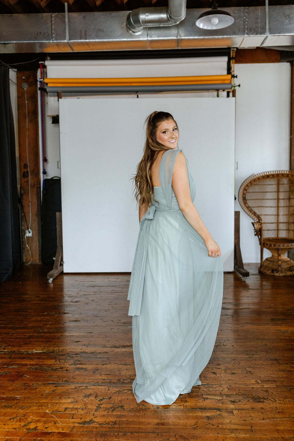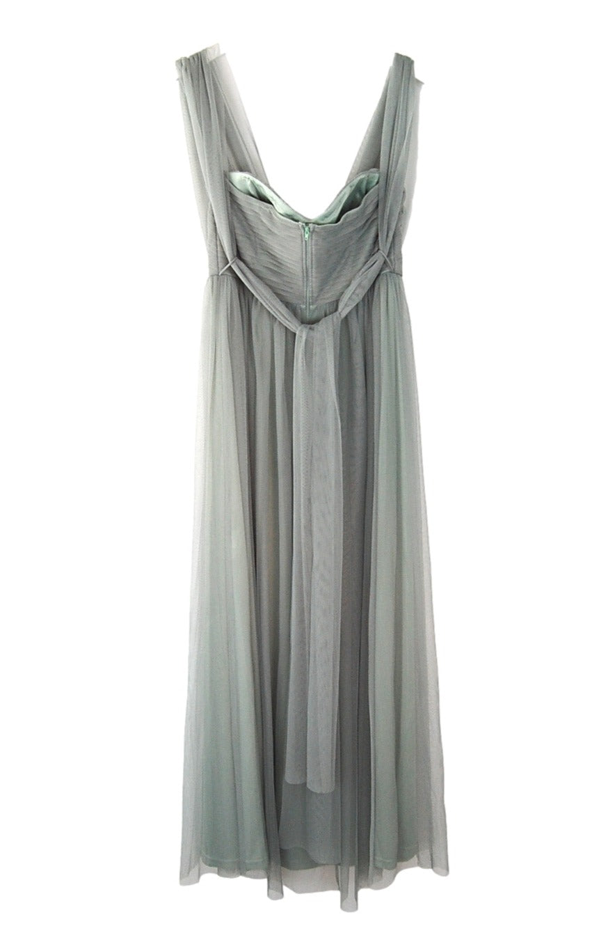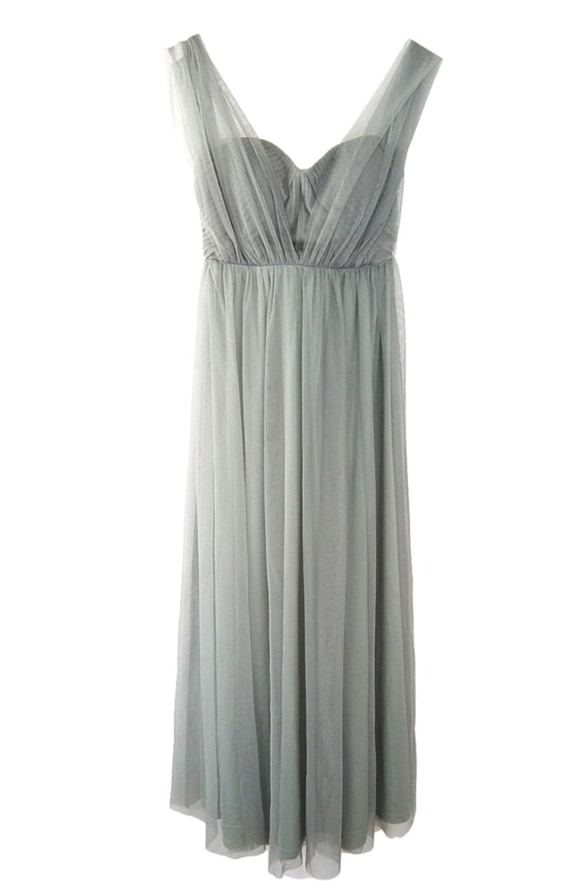 Tulle pleated, boned, sweetheart strapless bodice. 2 extra-long, semi-sheer, tulle front streamers attached at the waist tie a multitude of ways—strapless, halter, Grecian, etc. gathered A-line skirt.