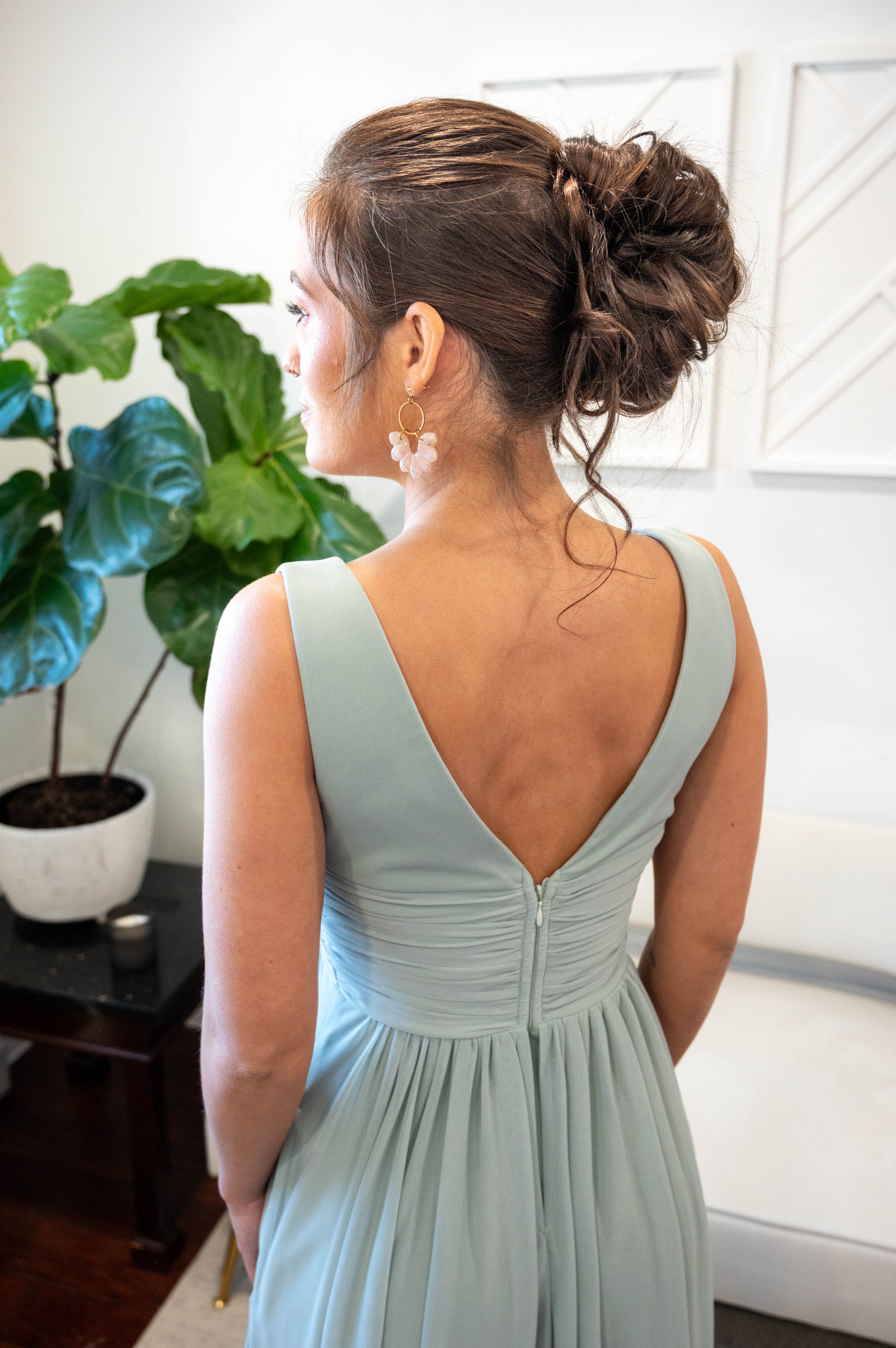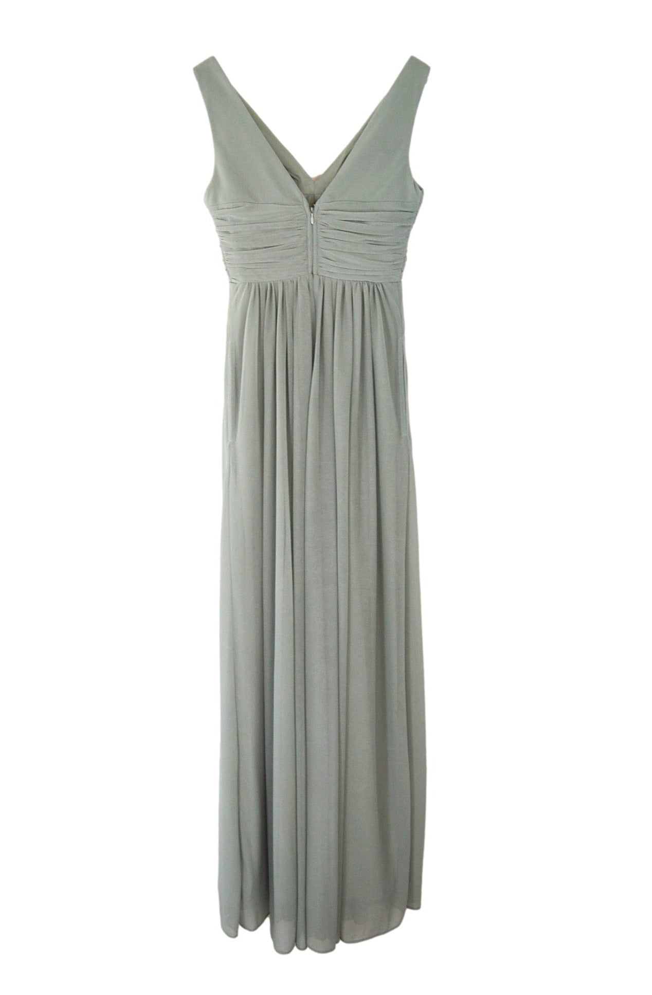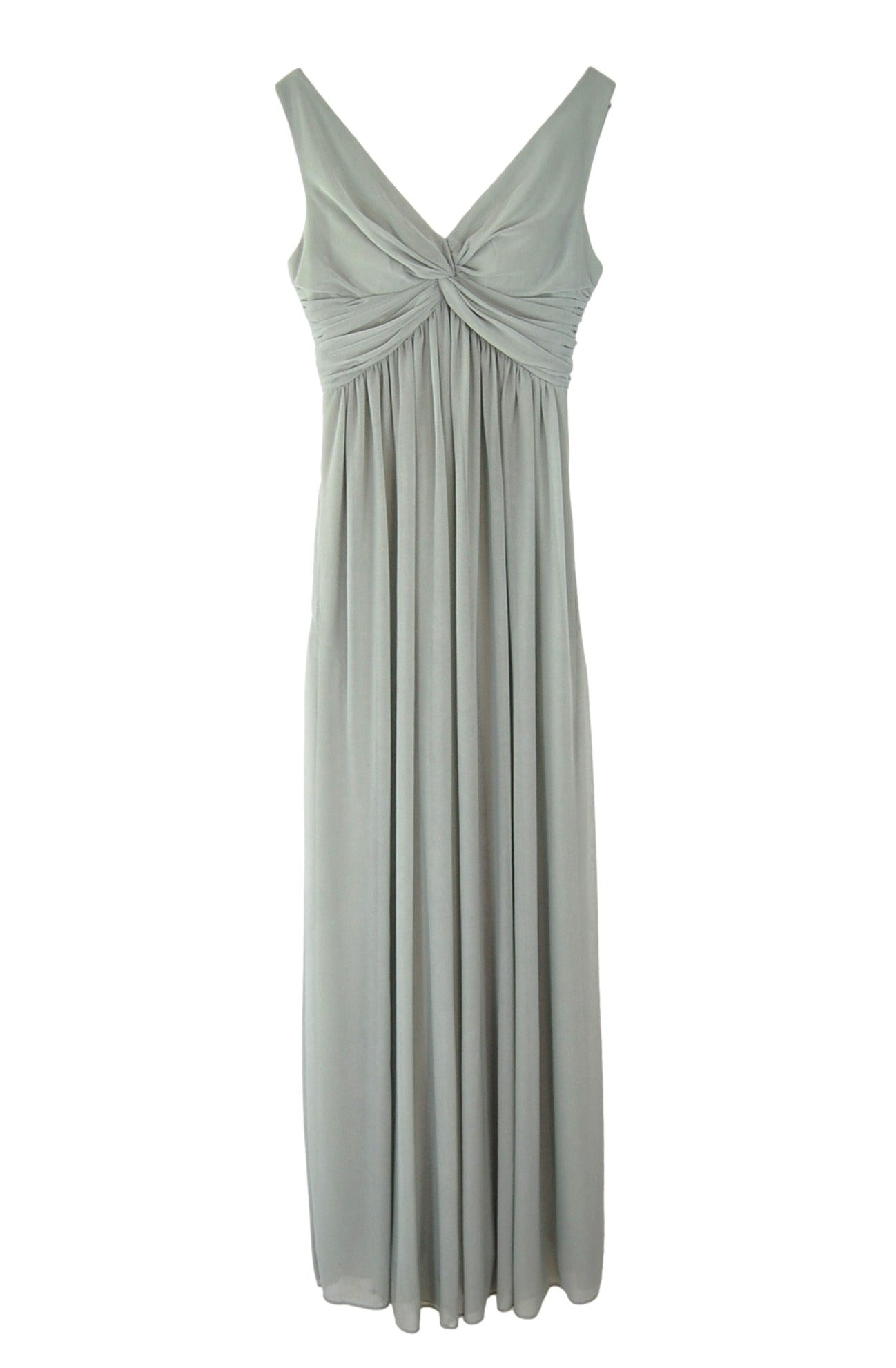 Soft jersey faux knotted v-neckline, extended empire bodice, 1.5" straps, v-back, gathered a-line skirt, side seam pockets.