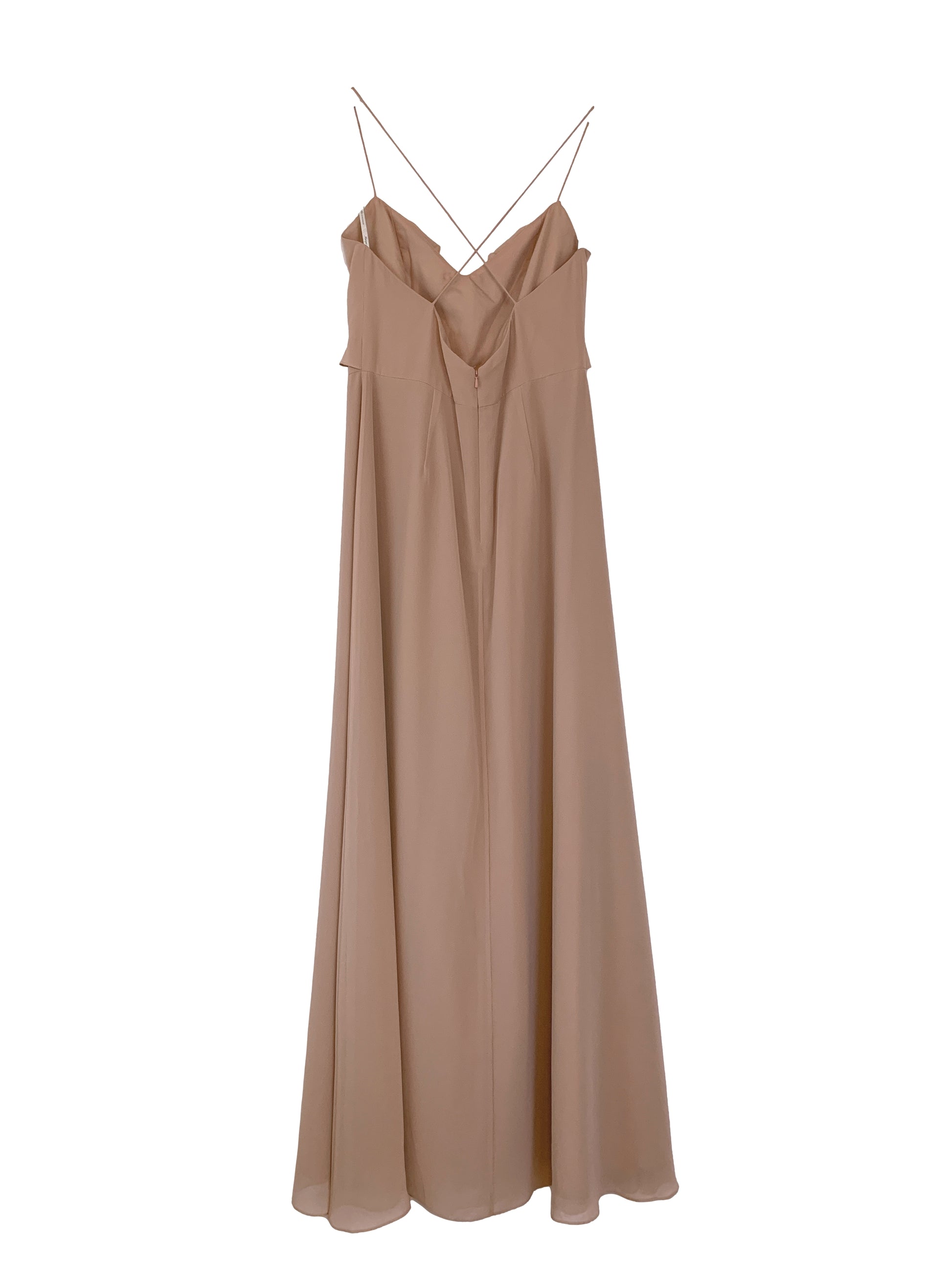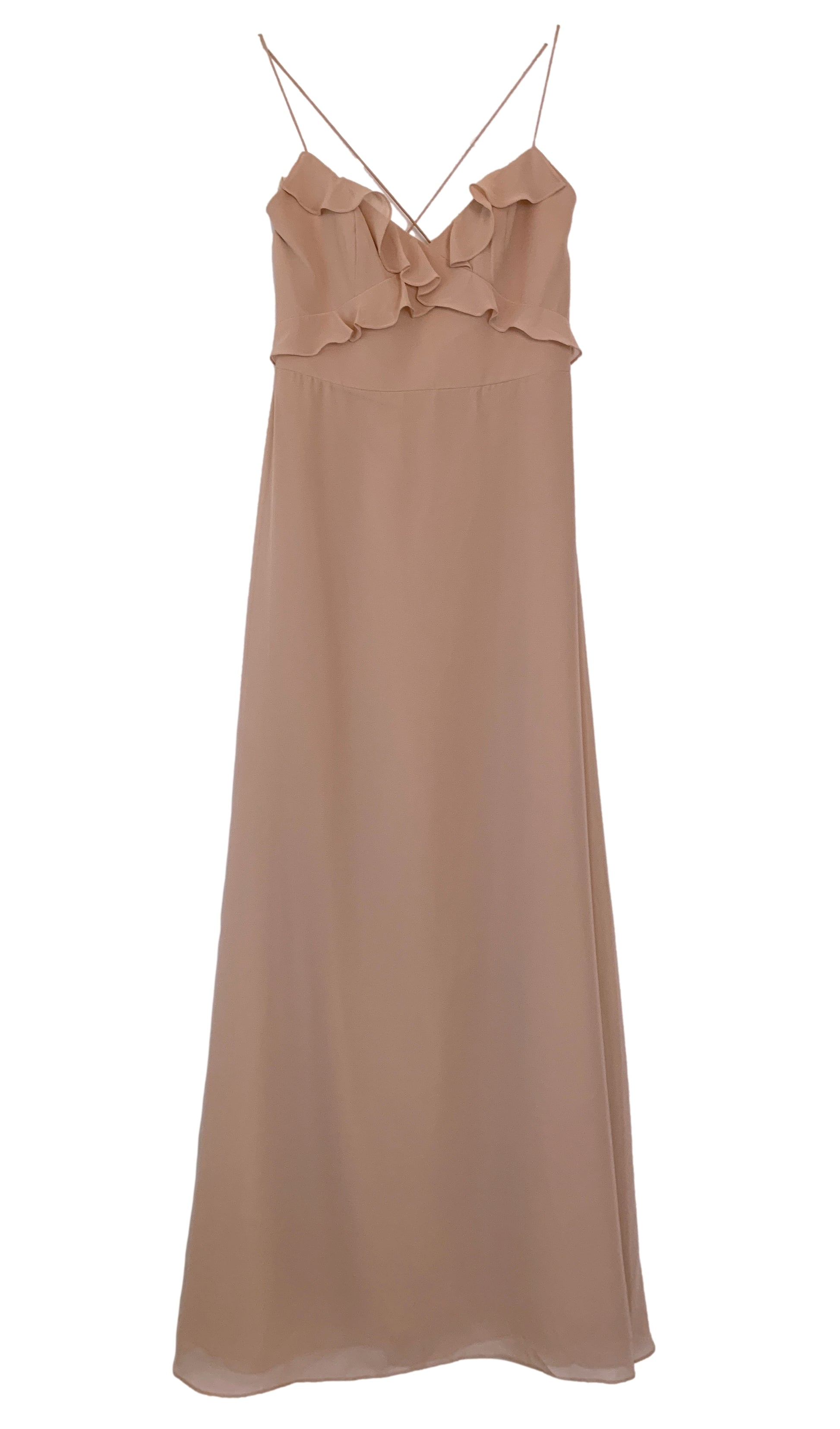 Blush colored v neck gown with ruffled detail at bodice front, empire waistline, spaghetti straps that cross at back, a-line skirt