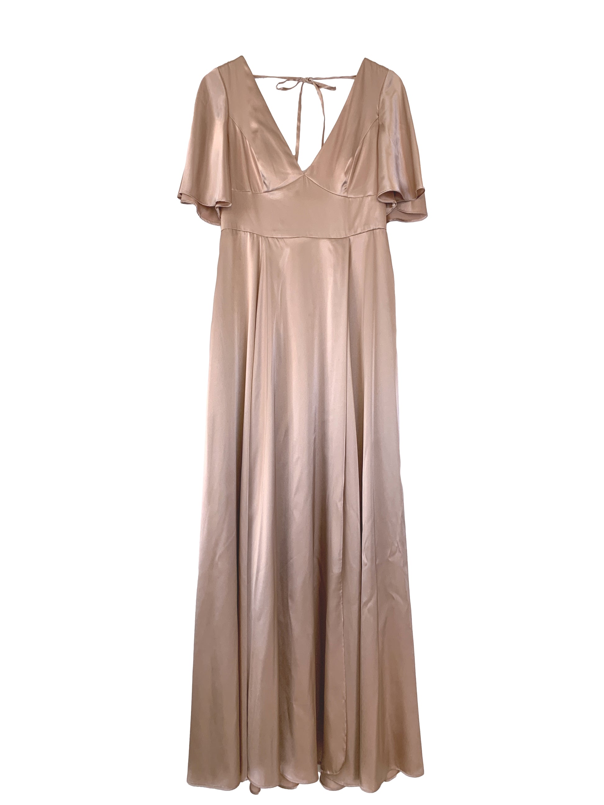 Soft satin charmeuse, deep v-neck bodice with inset padding, triangle waist, open back with tie at back neck, flutter sleeves, envelope skirt with slit at left leg