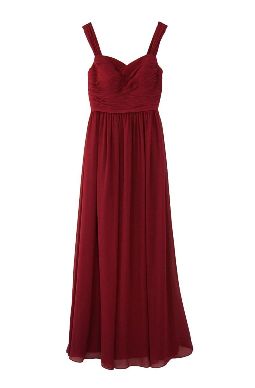Chiffon red v-neck princess seam lace bodice with 1" straps, v back, 1" grosgrain ribbon at waist, gathered a-line skirt, slit at left leg.