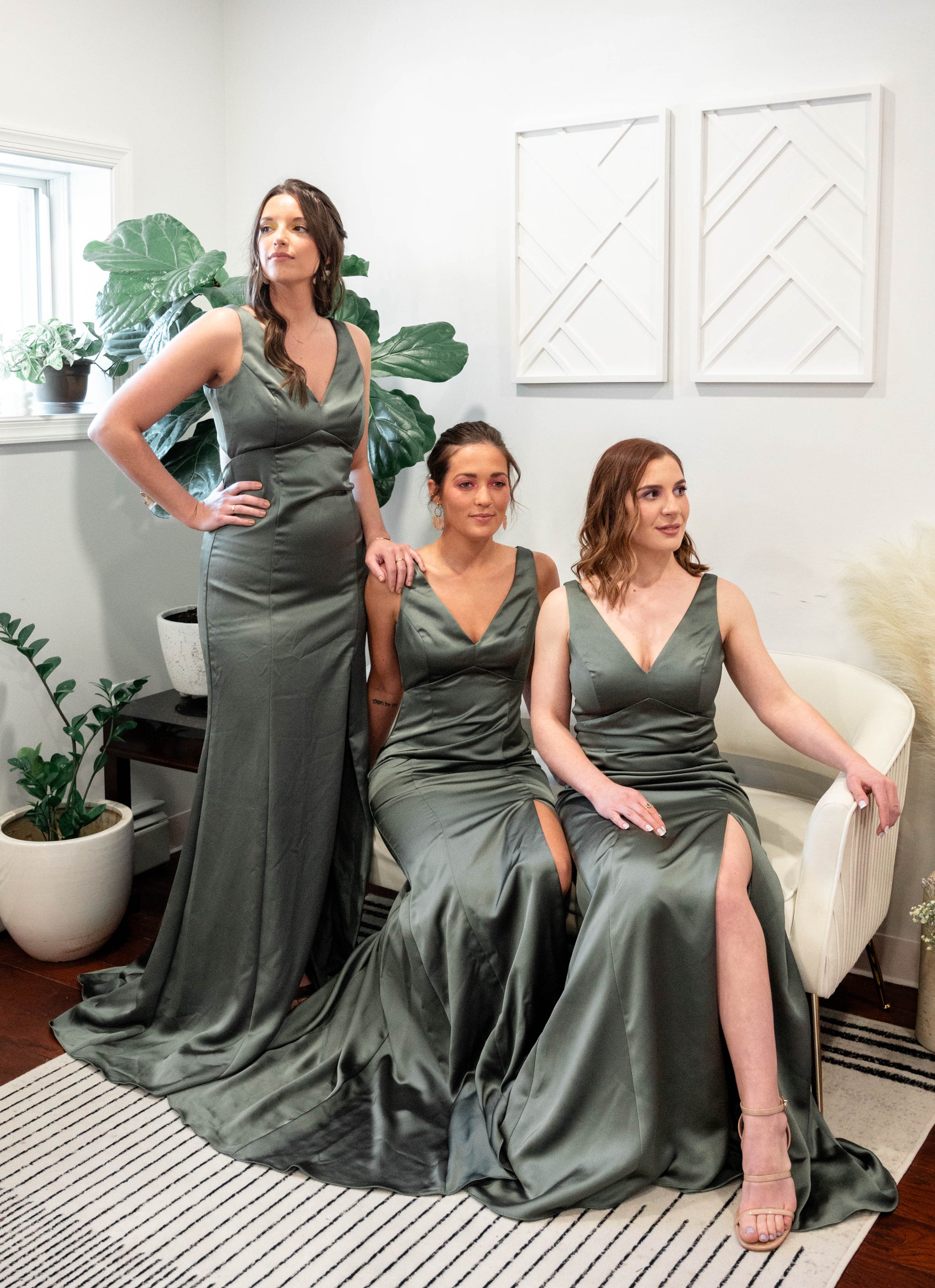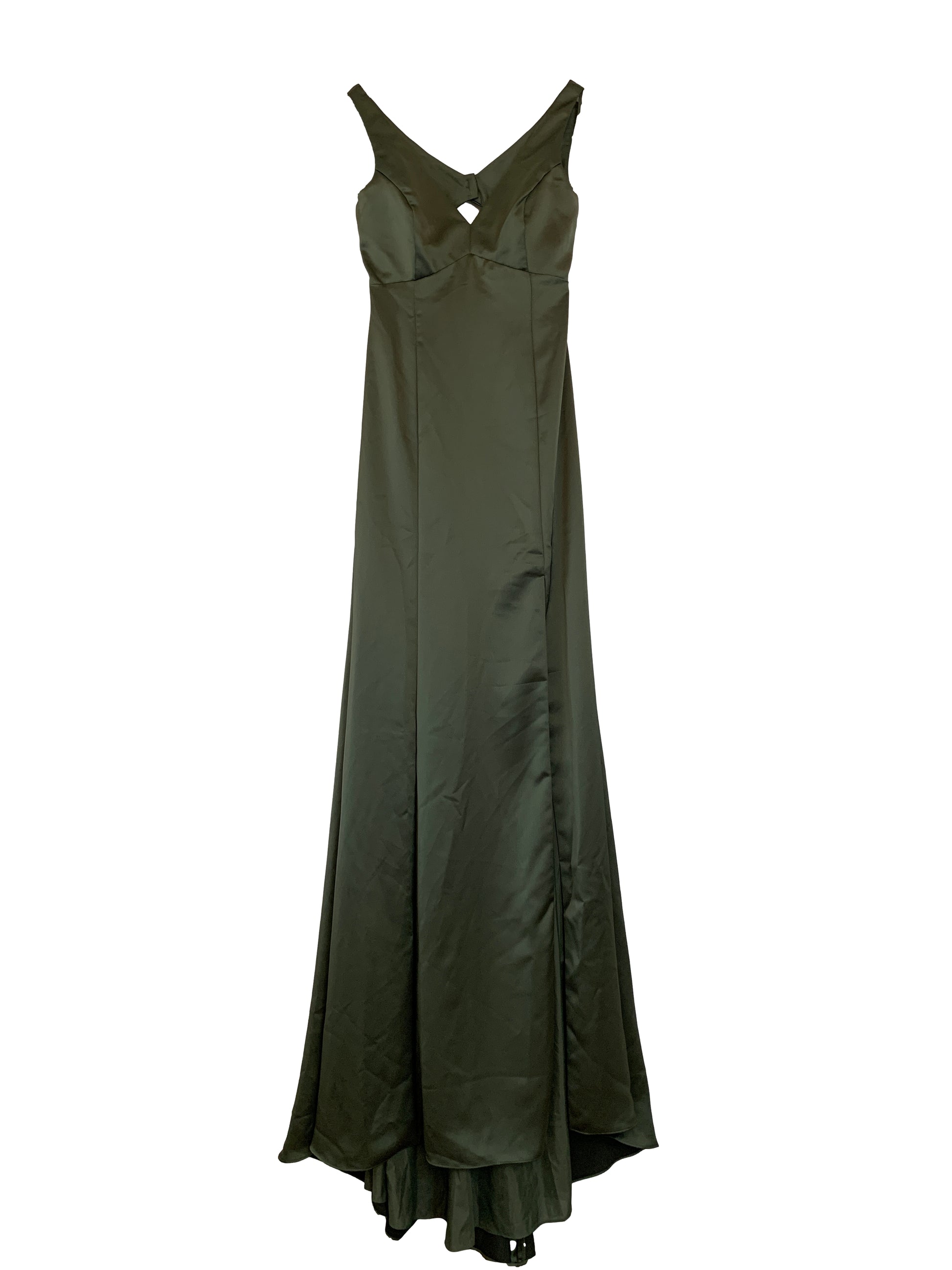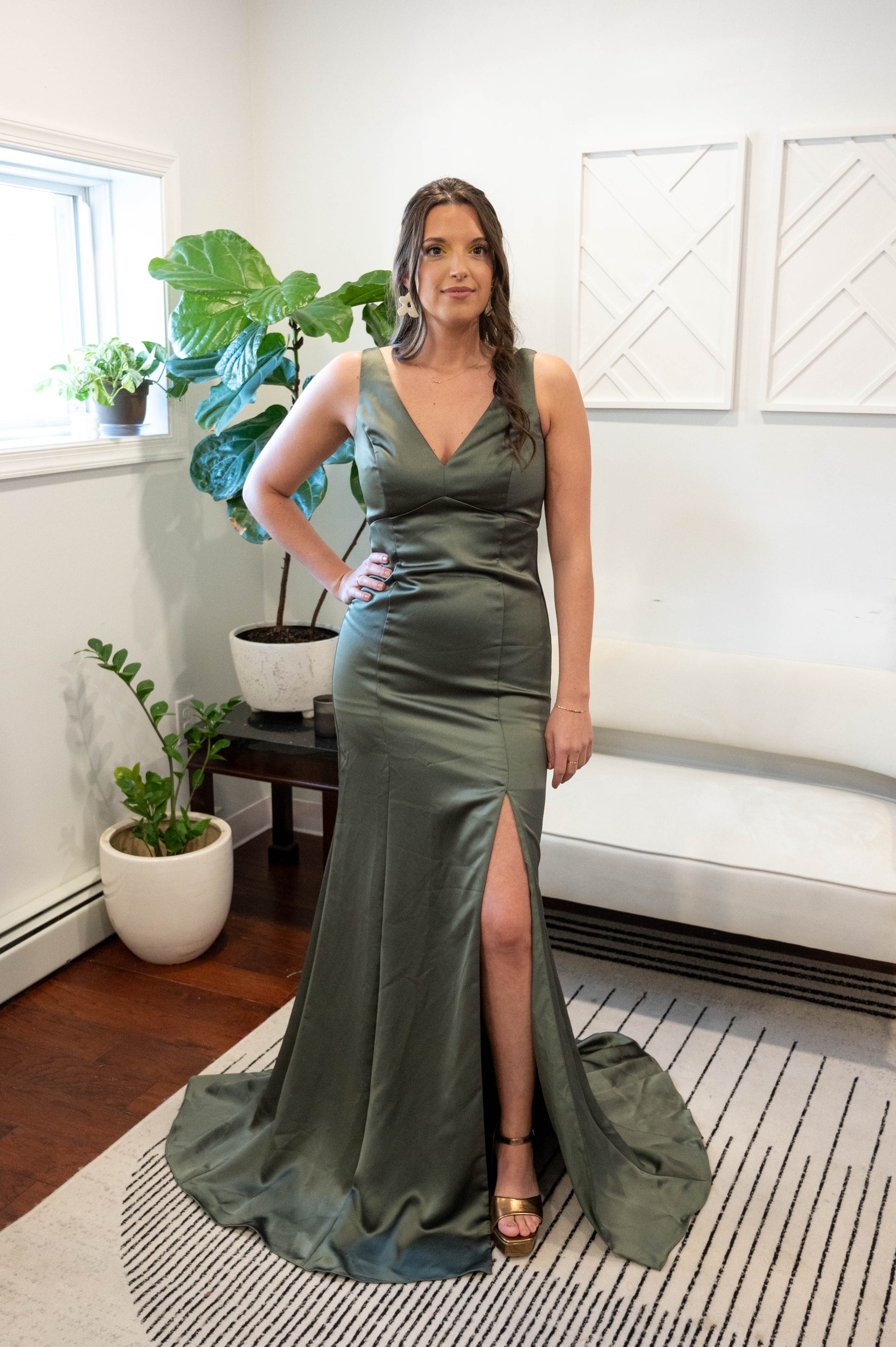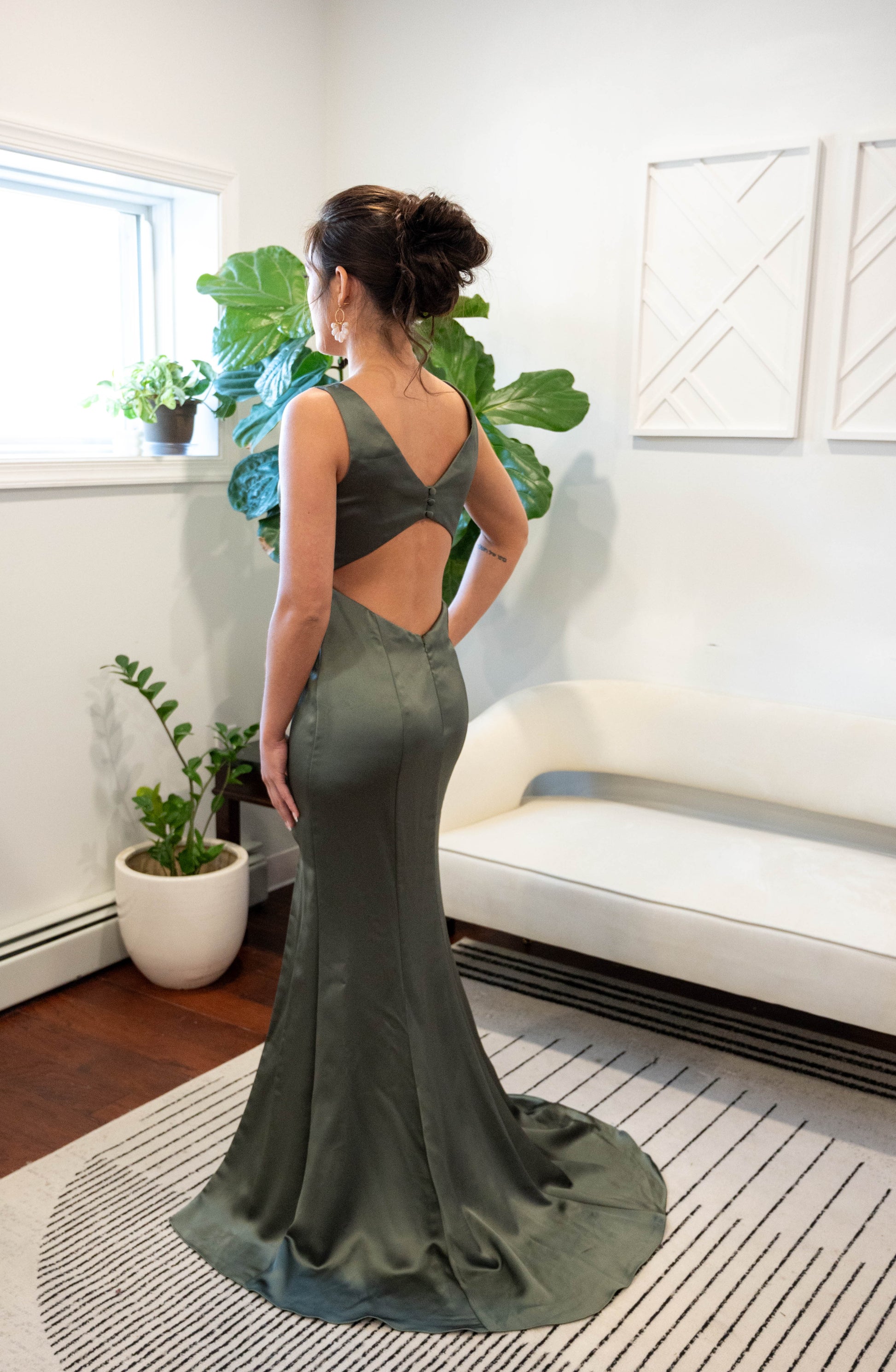 Satin v-neck dress with triangle empire waistline, princess seams, open back with elegant button details, fit and flare skirt with slit at left leg