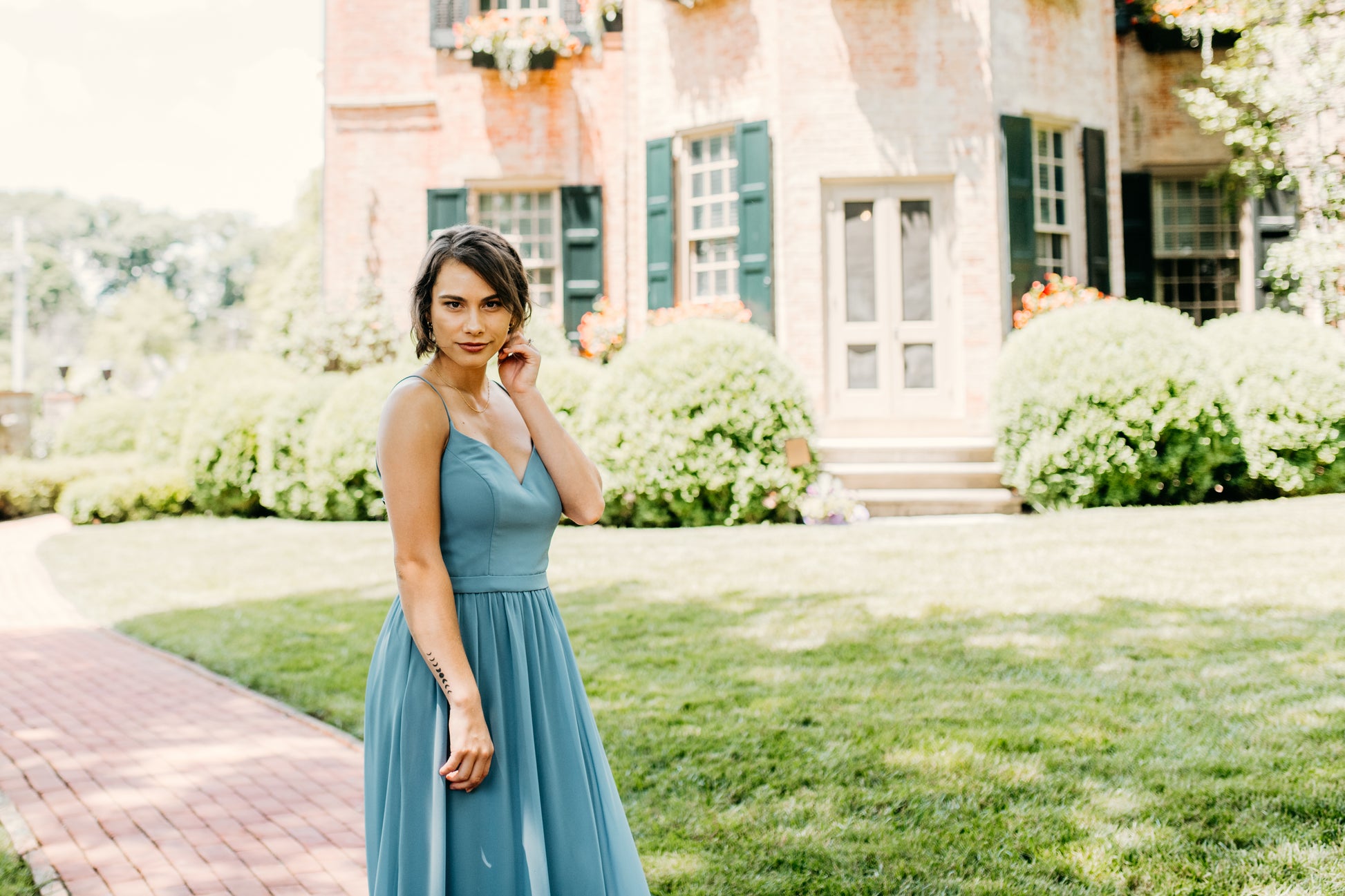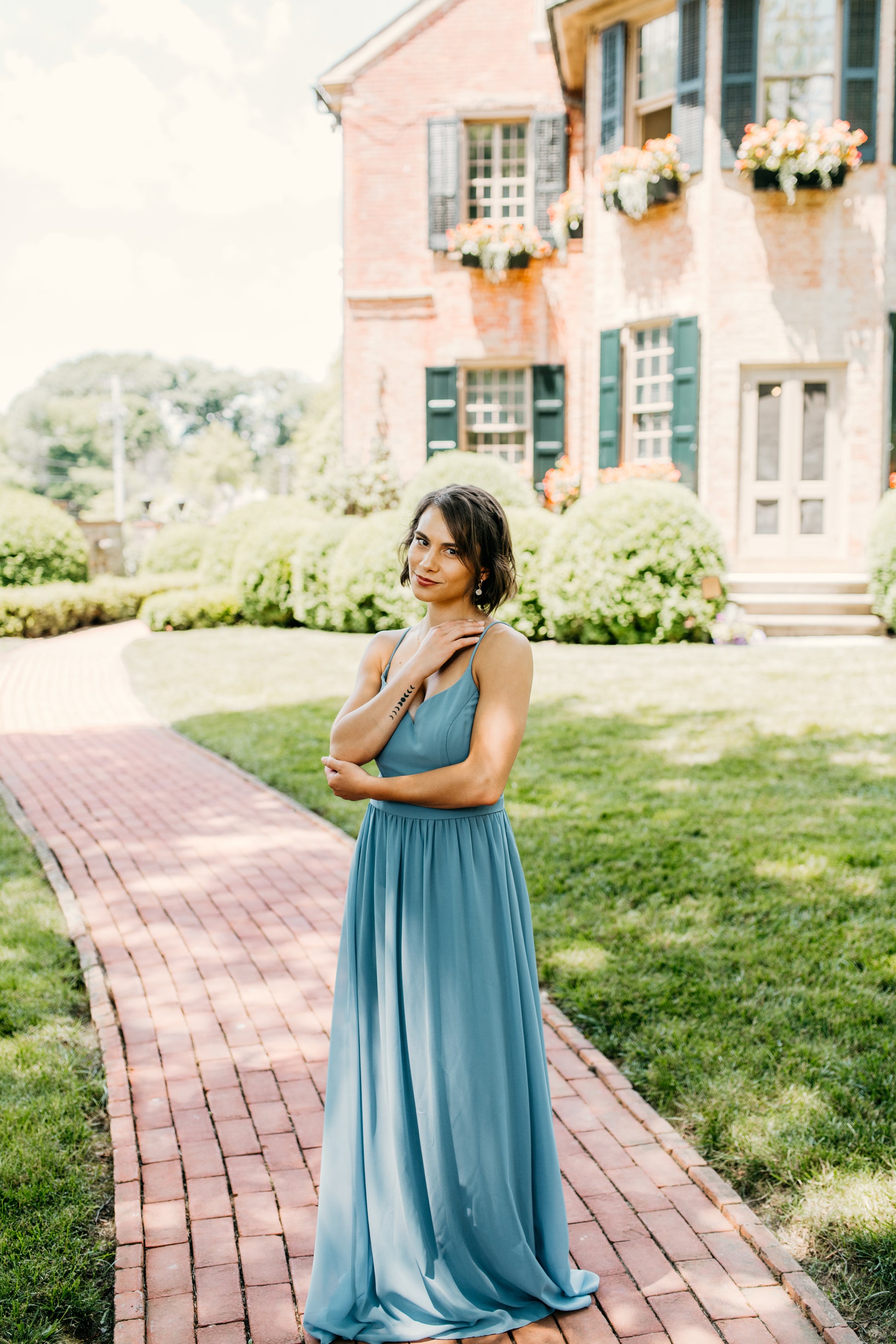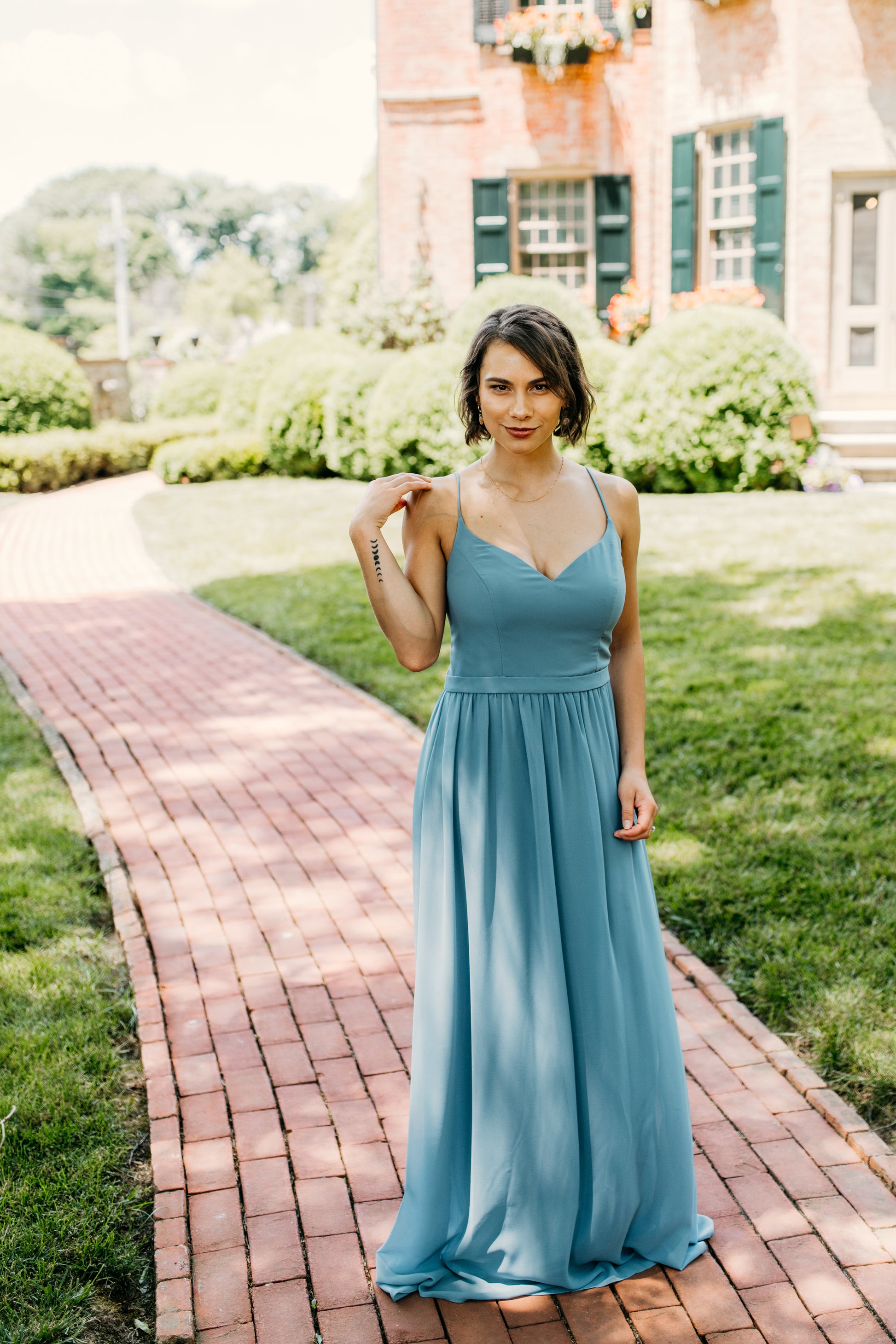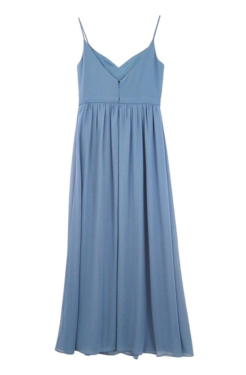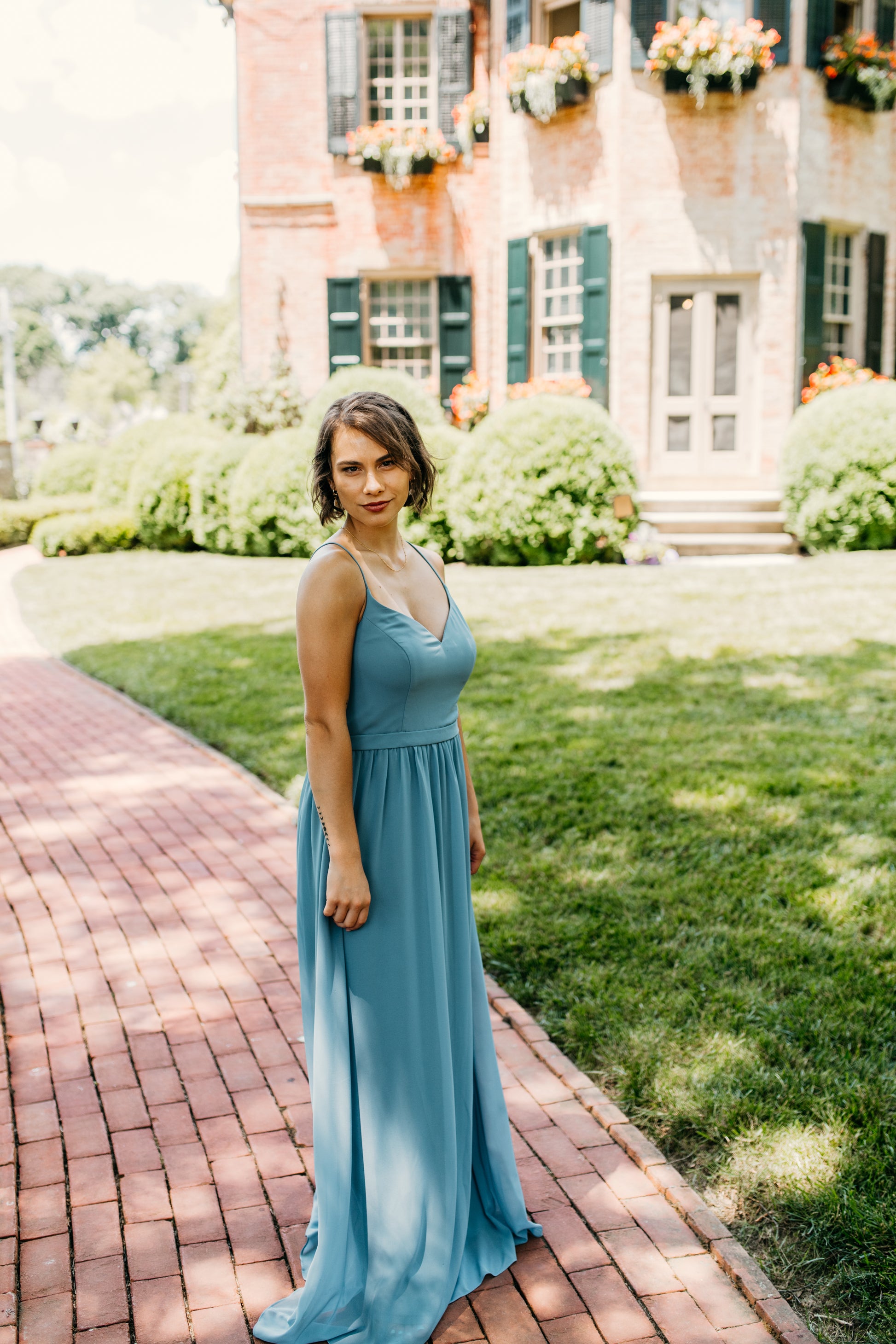 Chiffon v-neck princess seam bodice, spaghetti straps, v back, 1.25" belt at waist, gathered a-line skirt