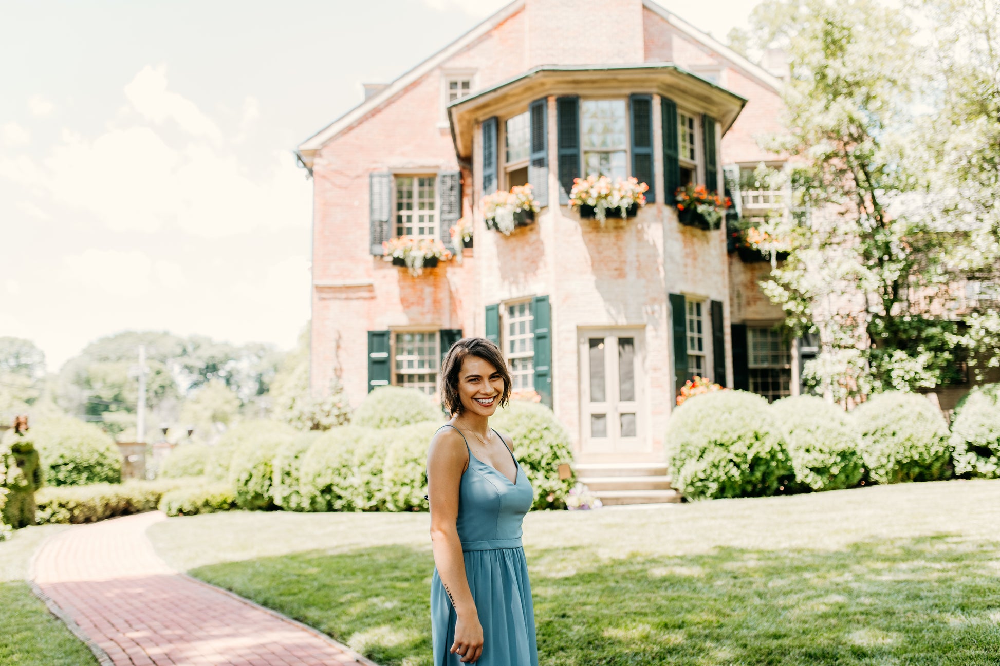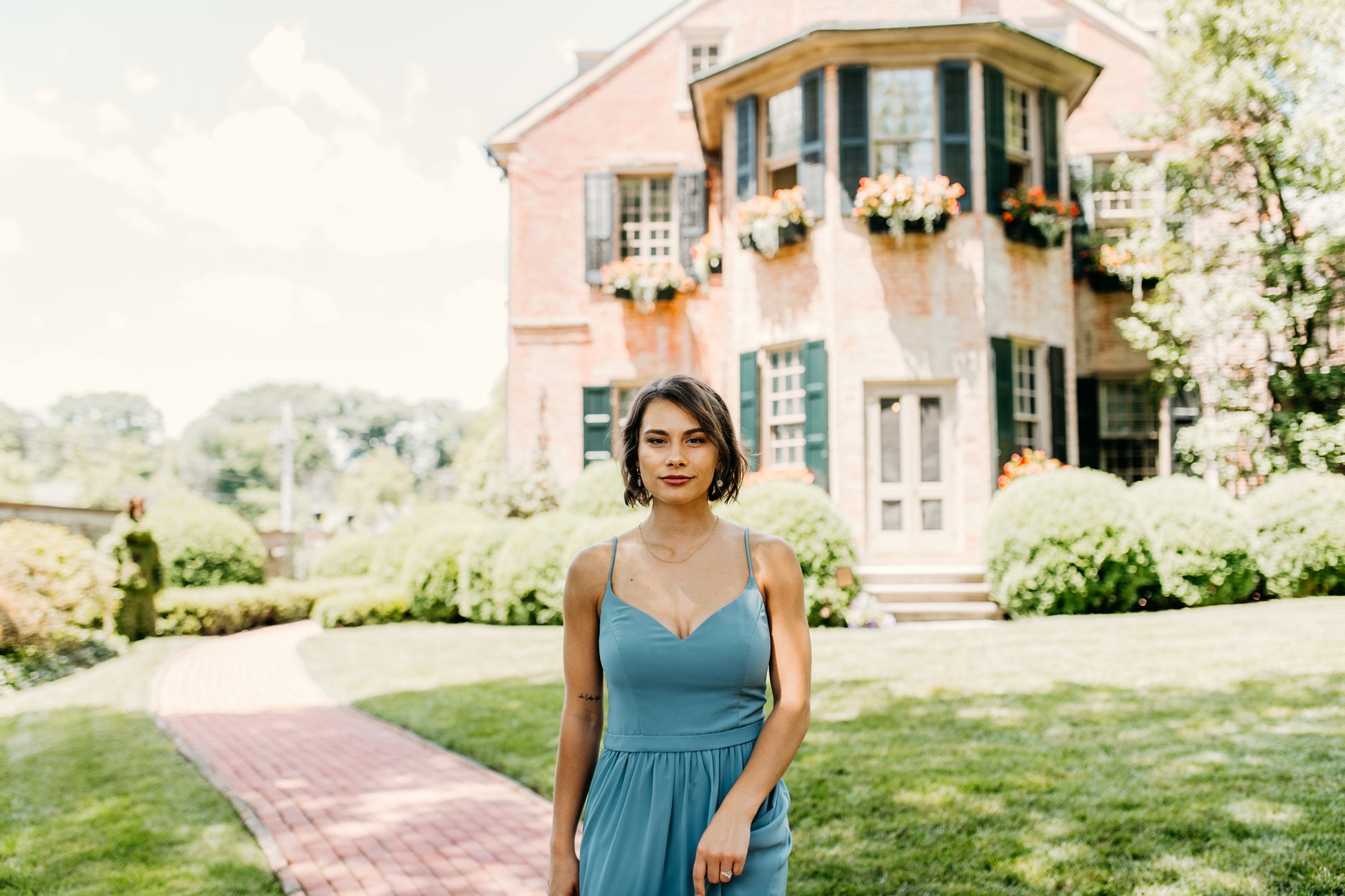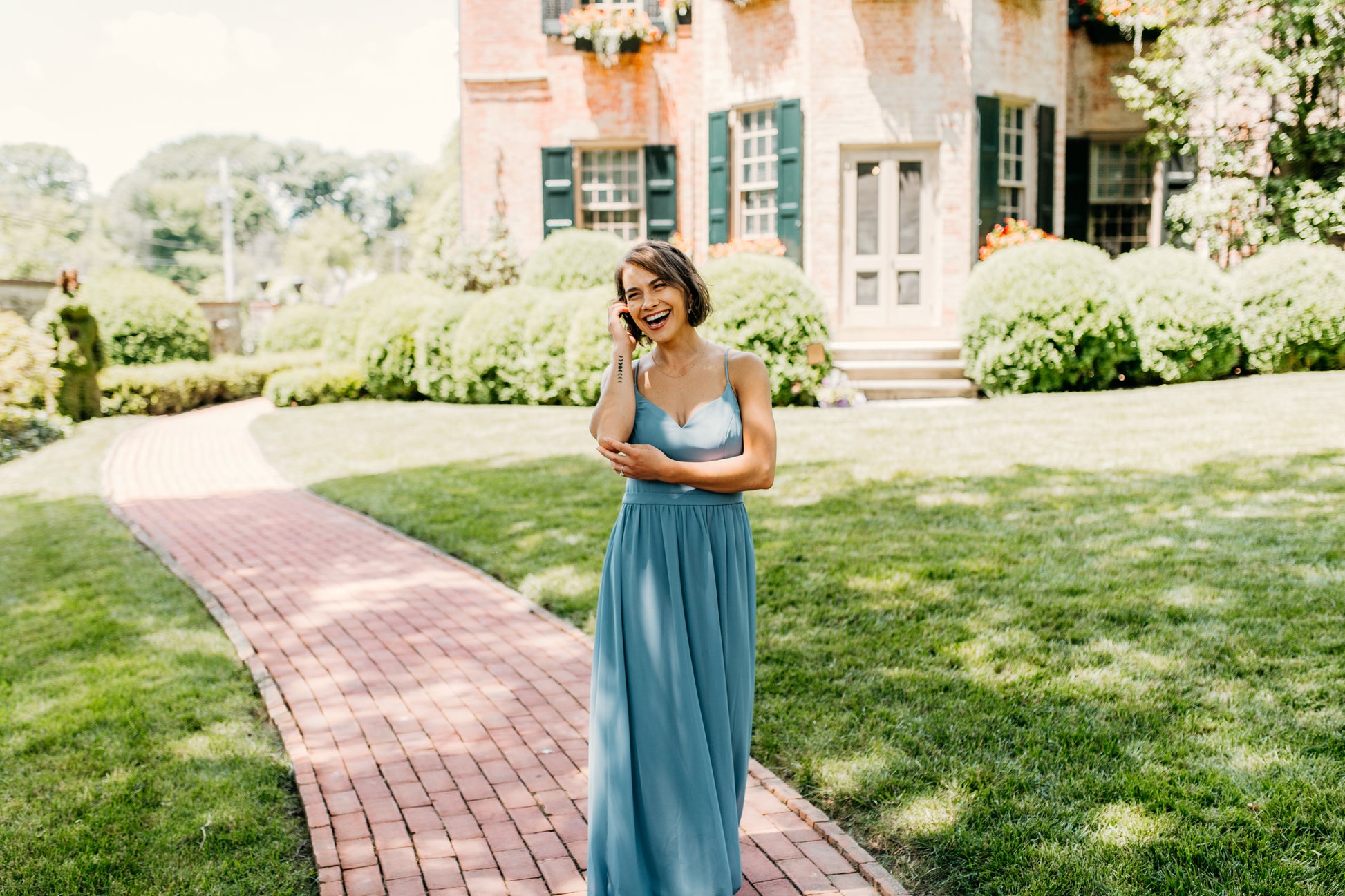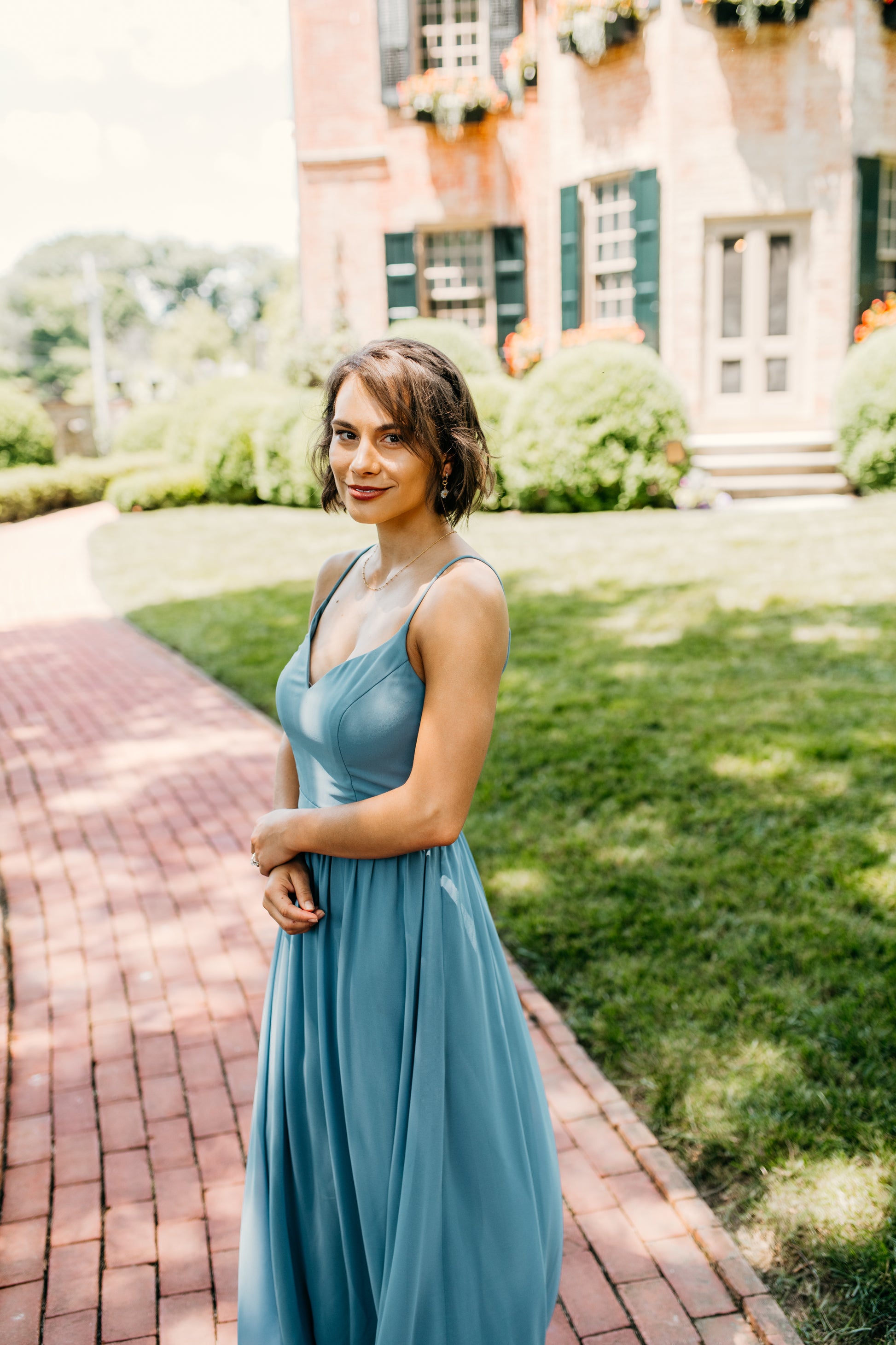 Chiffon v-neck princess seam bodice, spaghetti straps, v back, 1.25" belt at waist, gathered a-line skirt