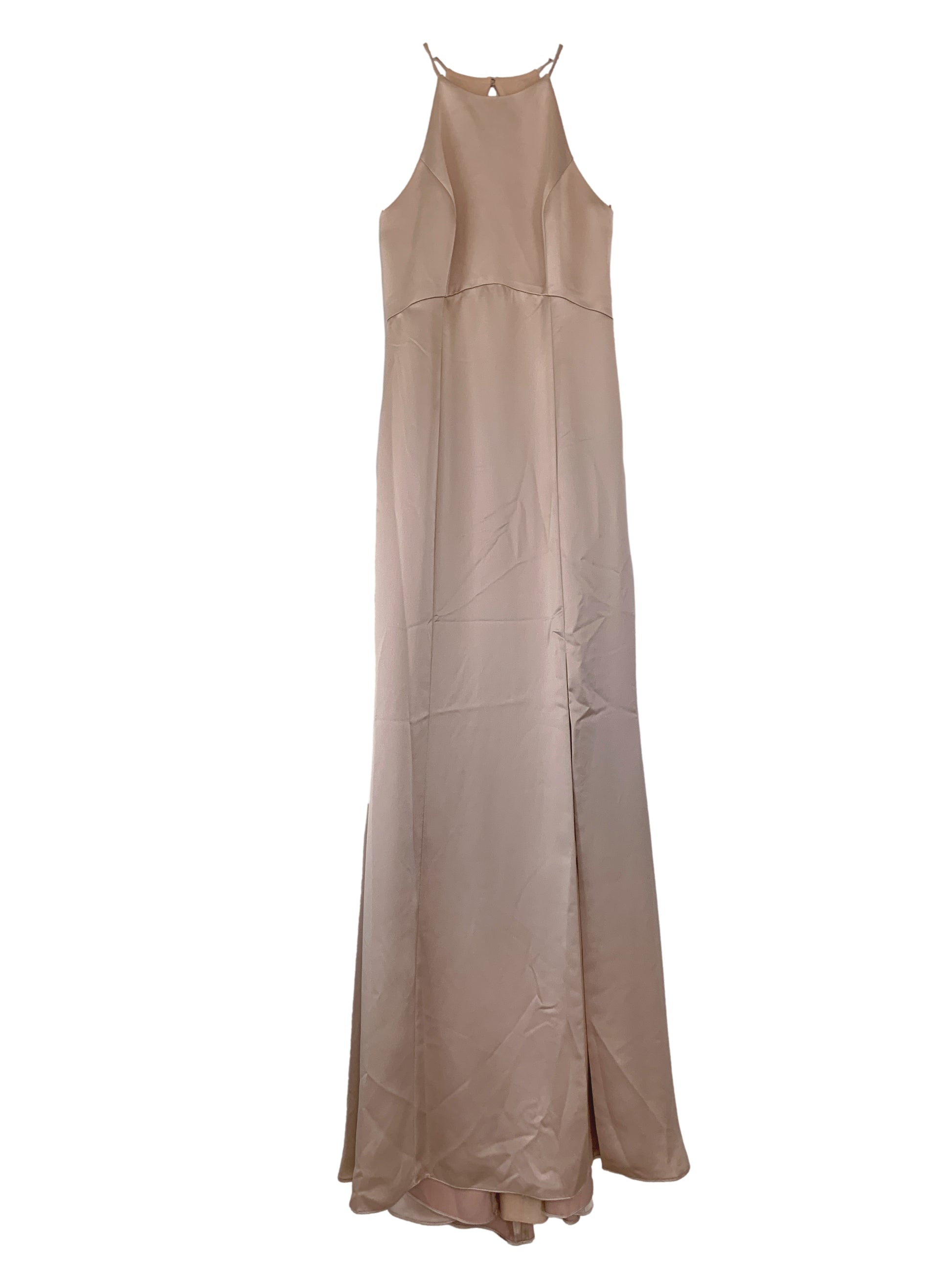 Soft satin high neck halter princess seam bodice with spaghetti straps, open back, a-line skirt with slit at left leg