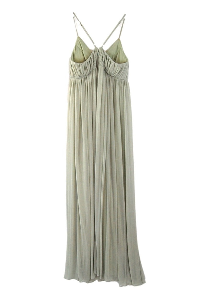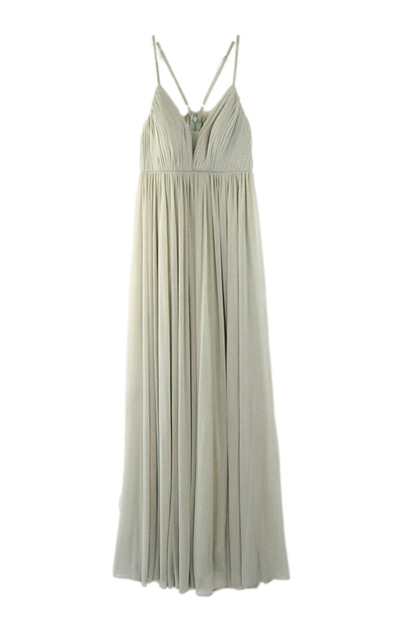 Jersey deep-v empire bodice, allover pleating with illusion panel at center front, built-in bust padding with adjustable racerback spaghetti straps, gathered a-line skirt