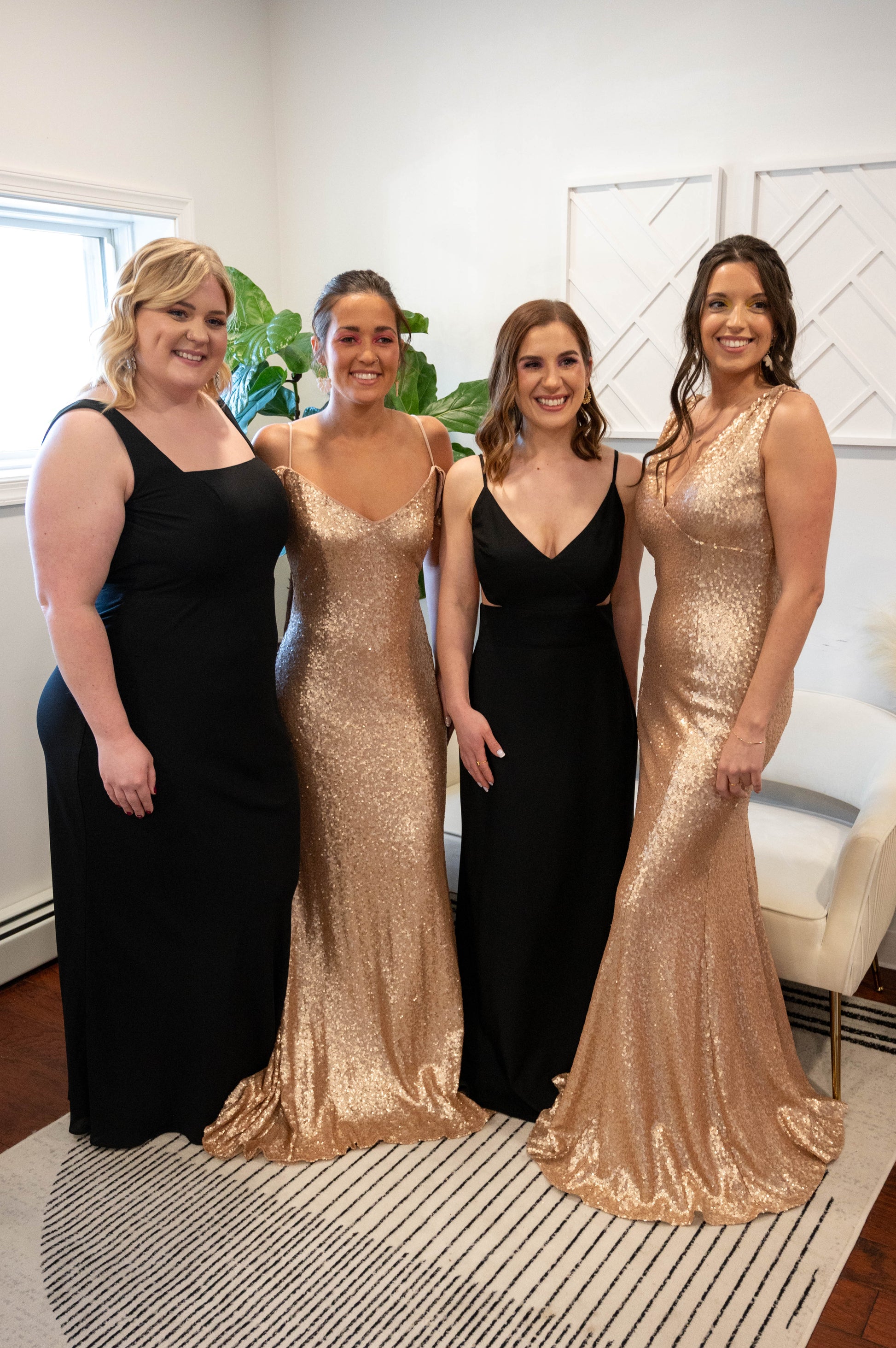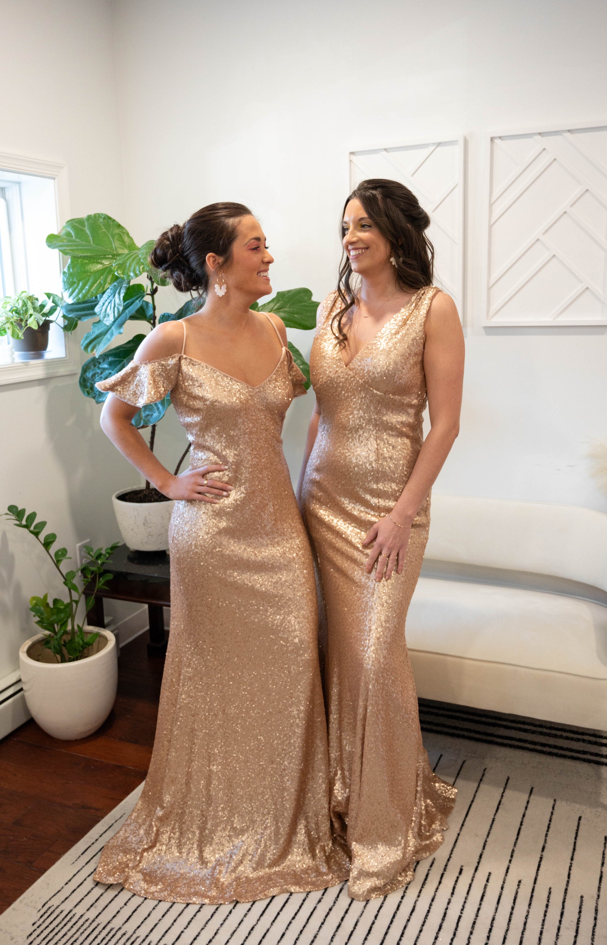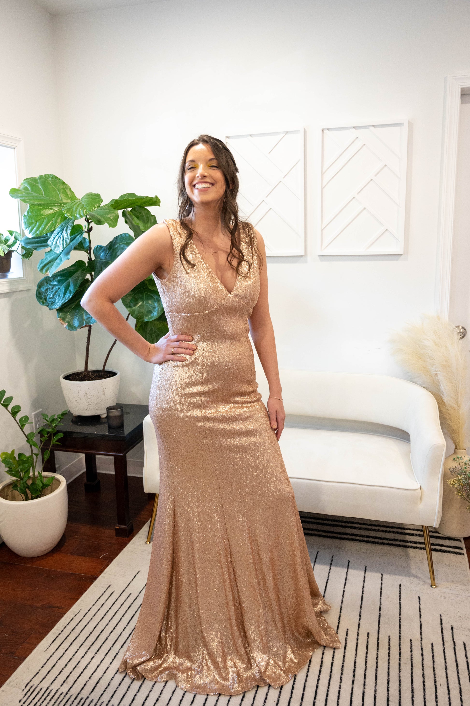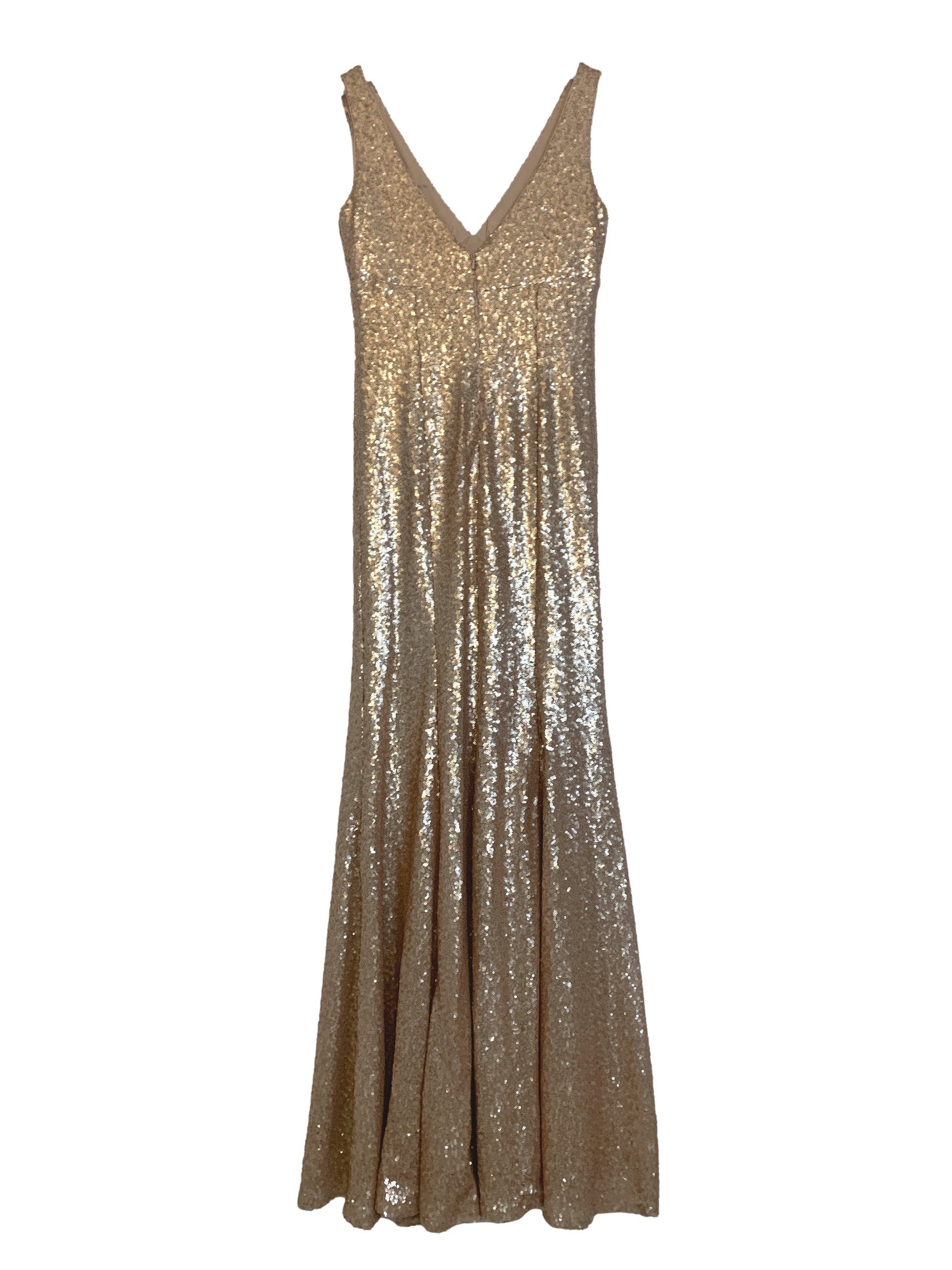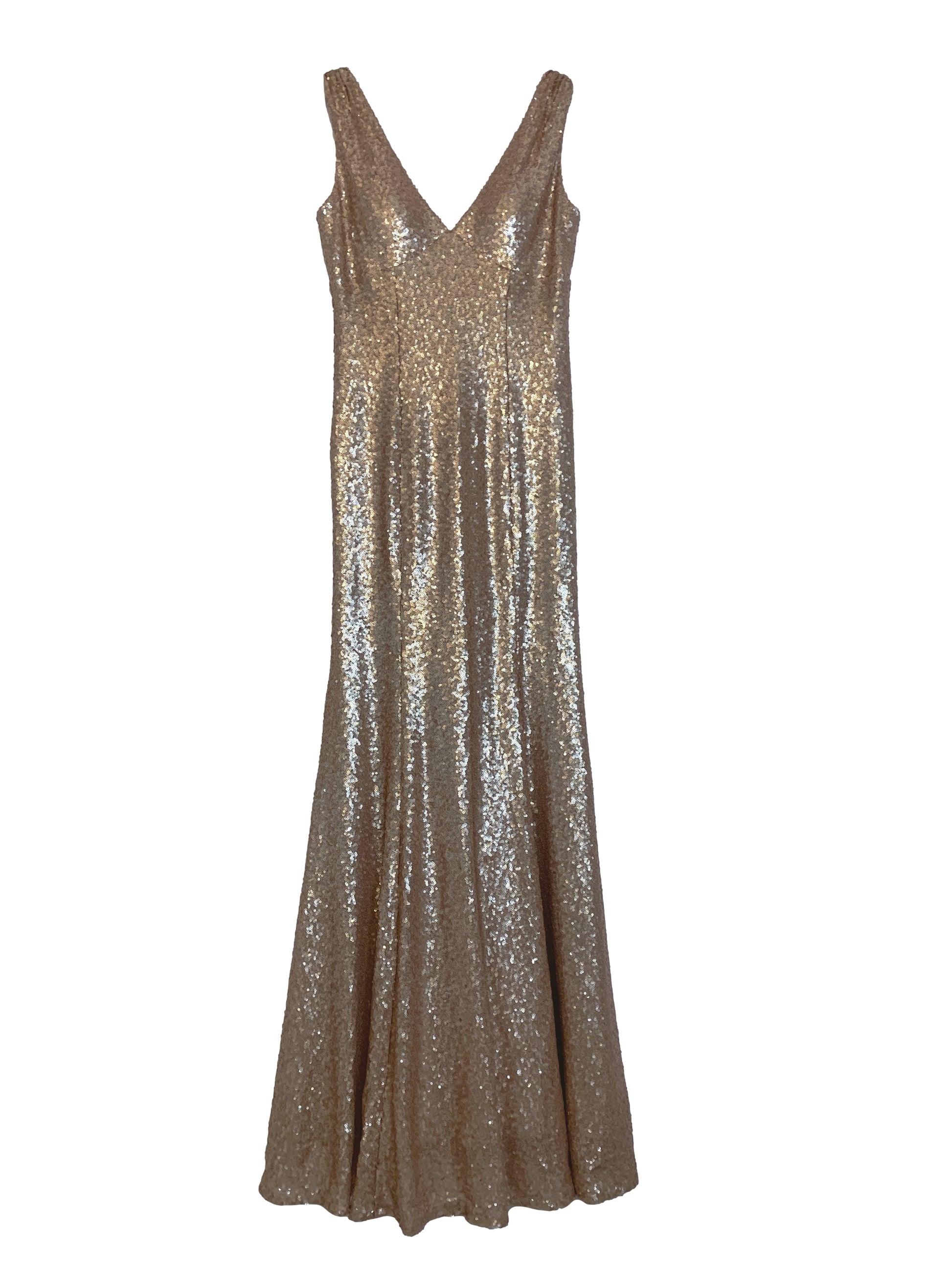Stunning gold sequin v-neck dress, 1.5" straps, empire bodice, v-back neckline, column skirt