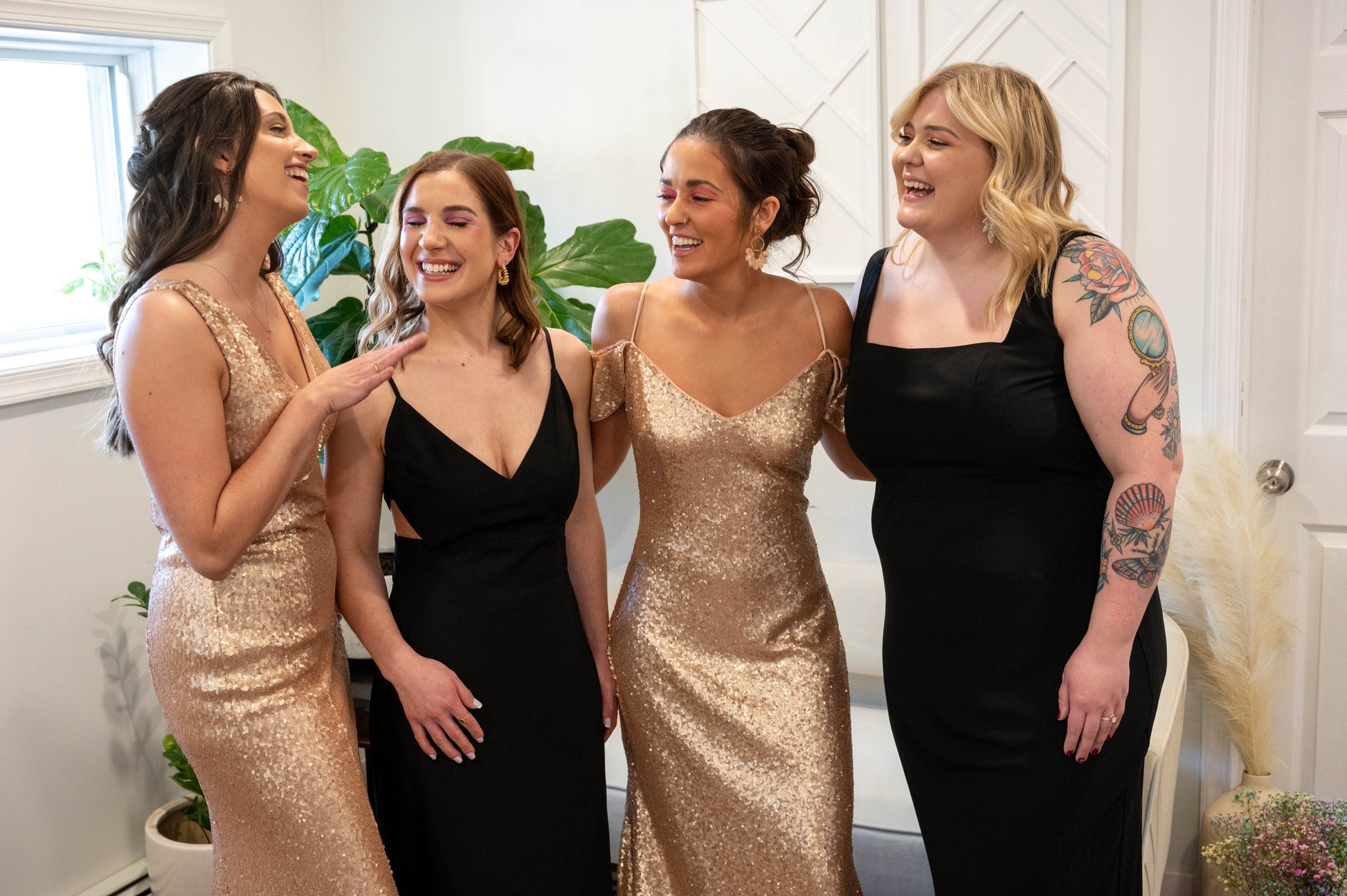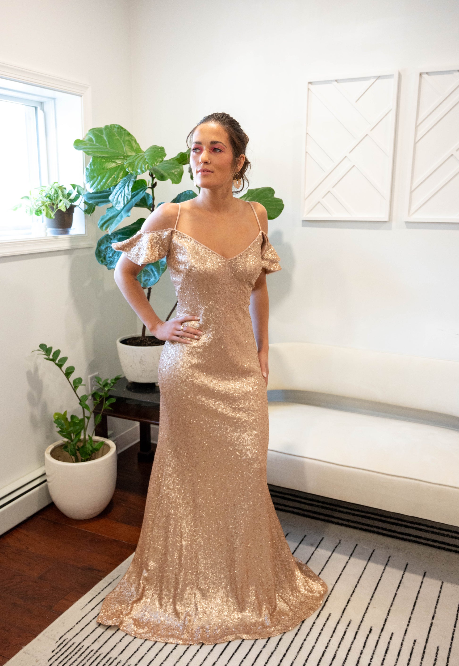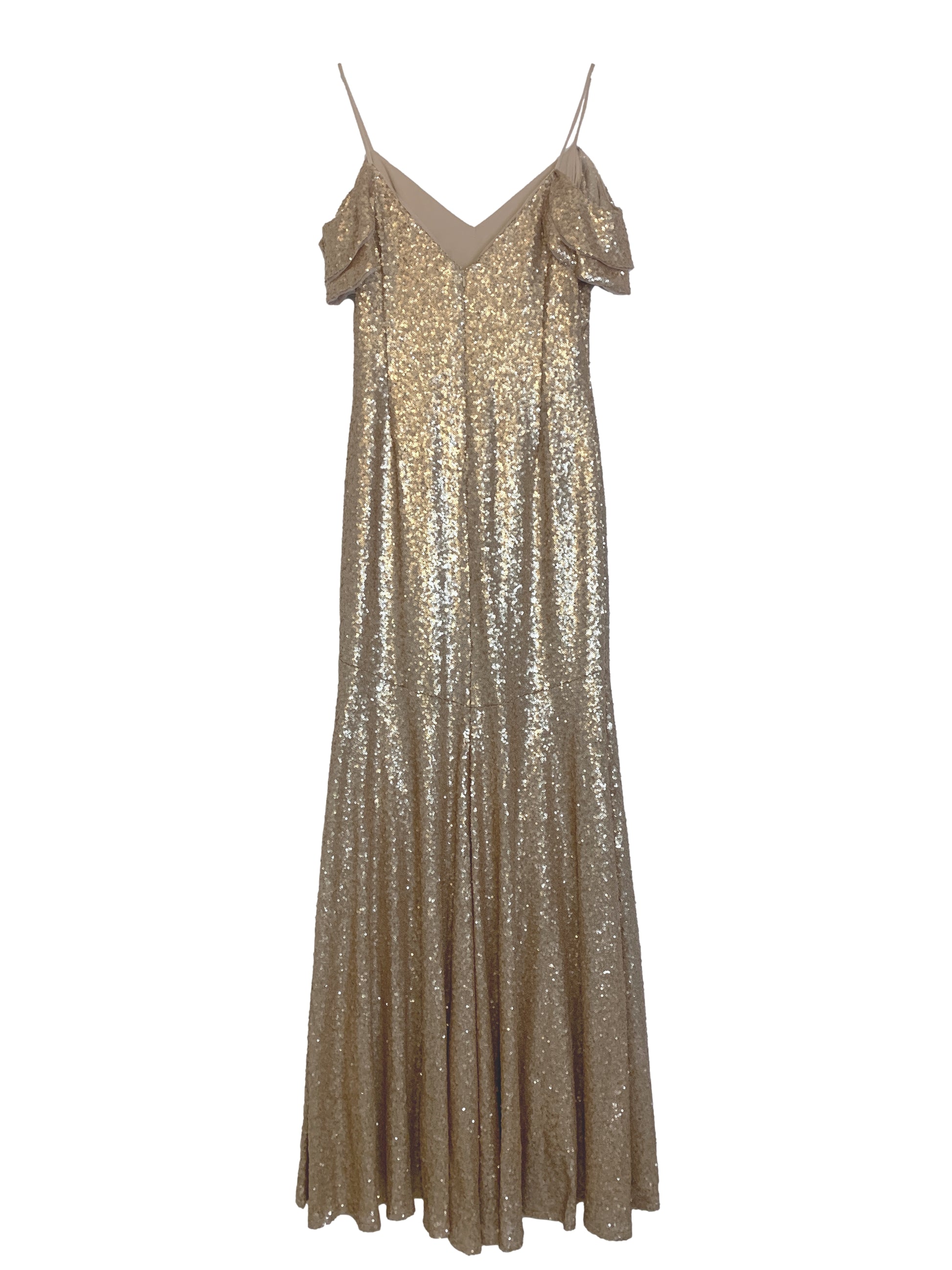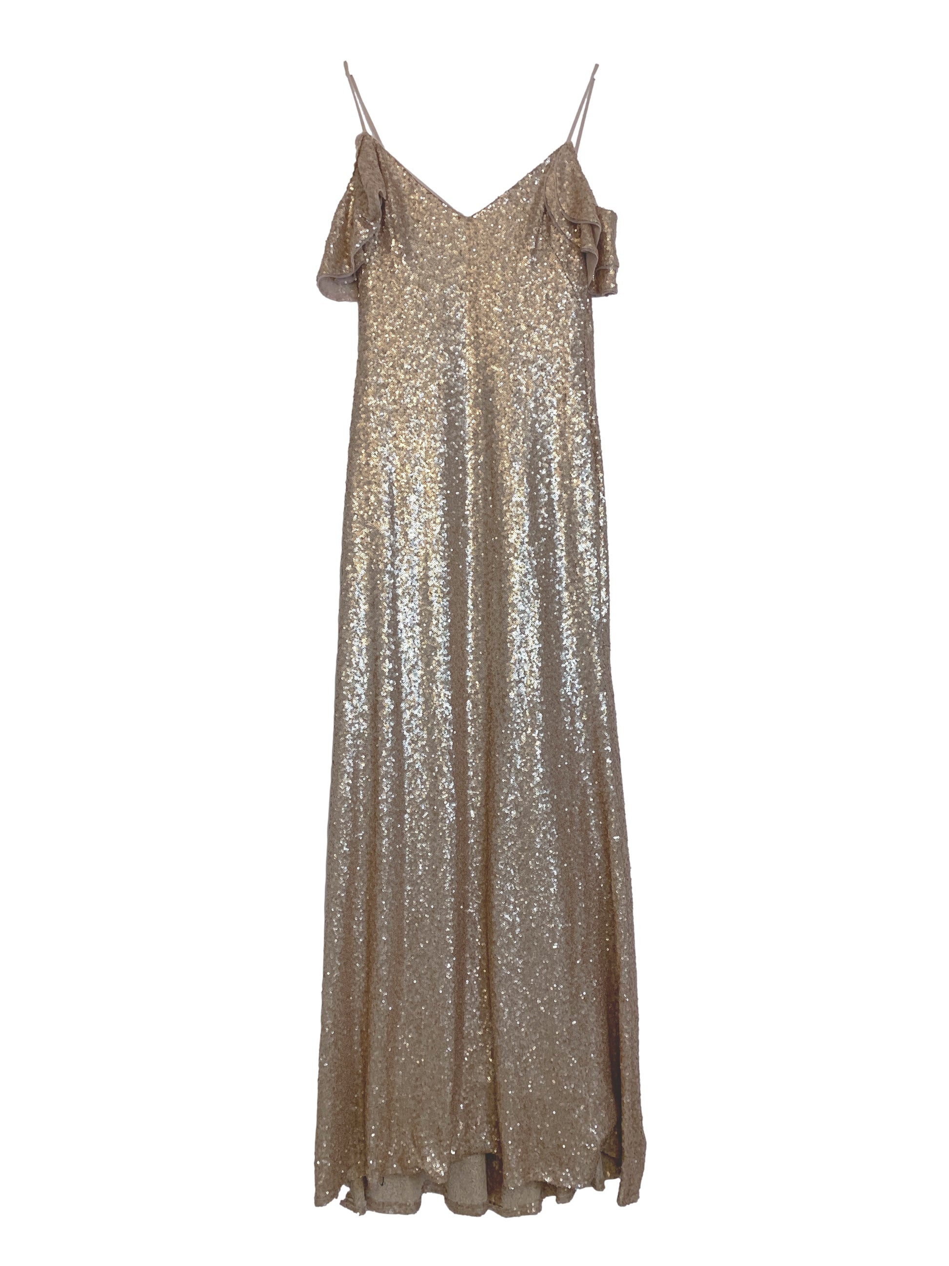 Elegant gold sequin v-neck dress, spaghetti straps, off-shoulder double shoulder ruffle detail, v-back neckline, a-line skirt