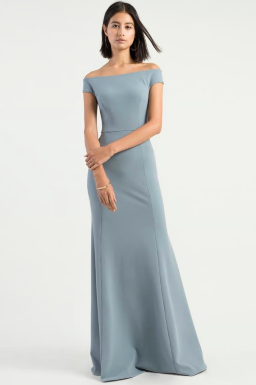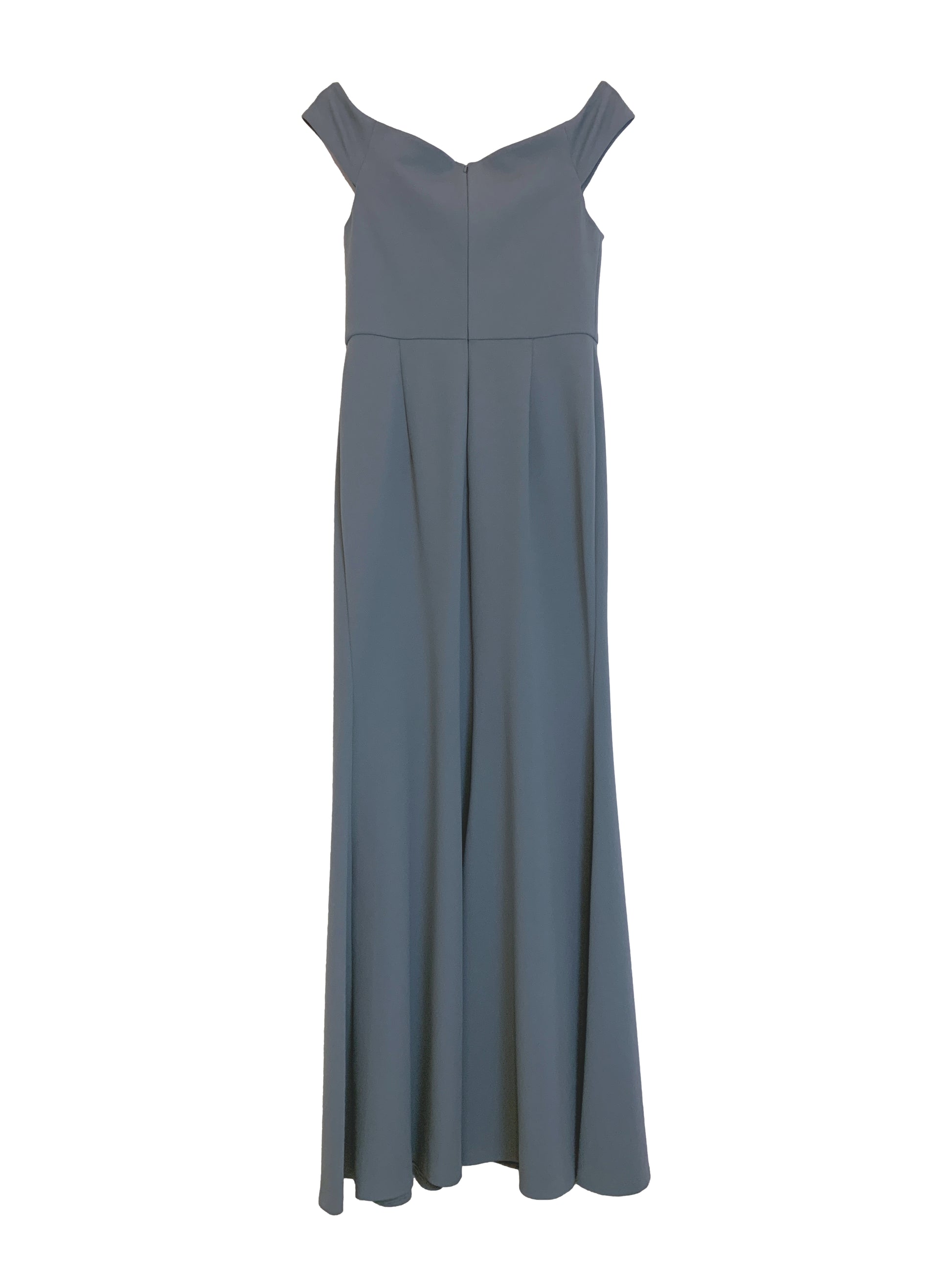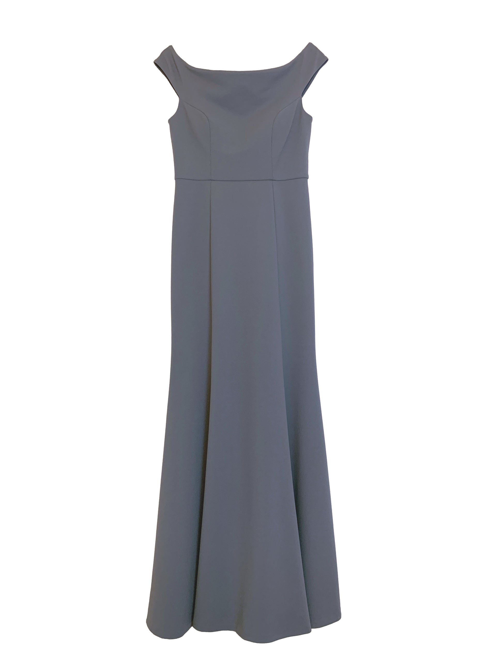 Soft crepe, off shoulder style, princess seam bodice, natural waist, princess seam a-line skirt