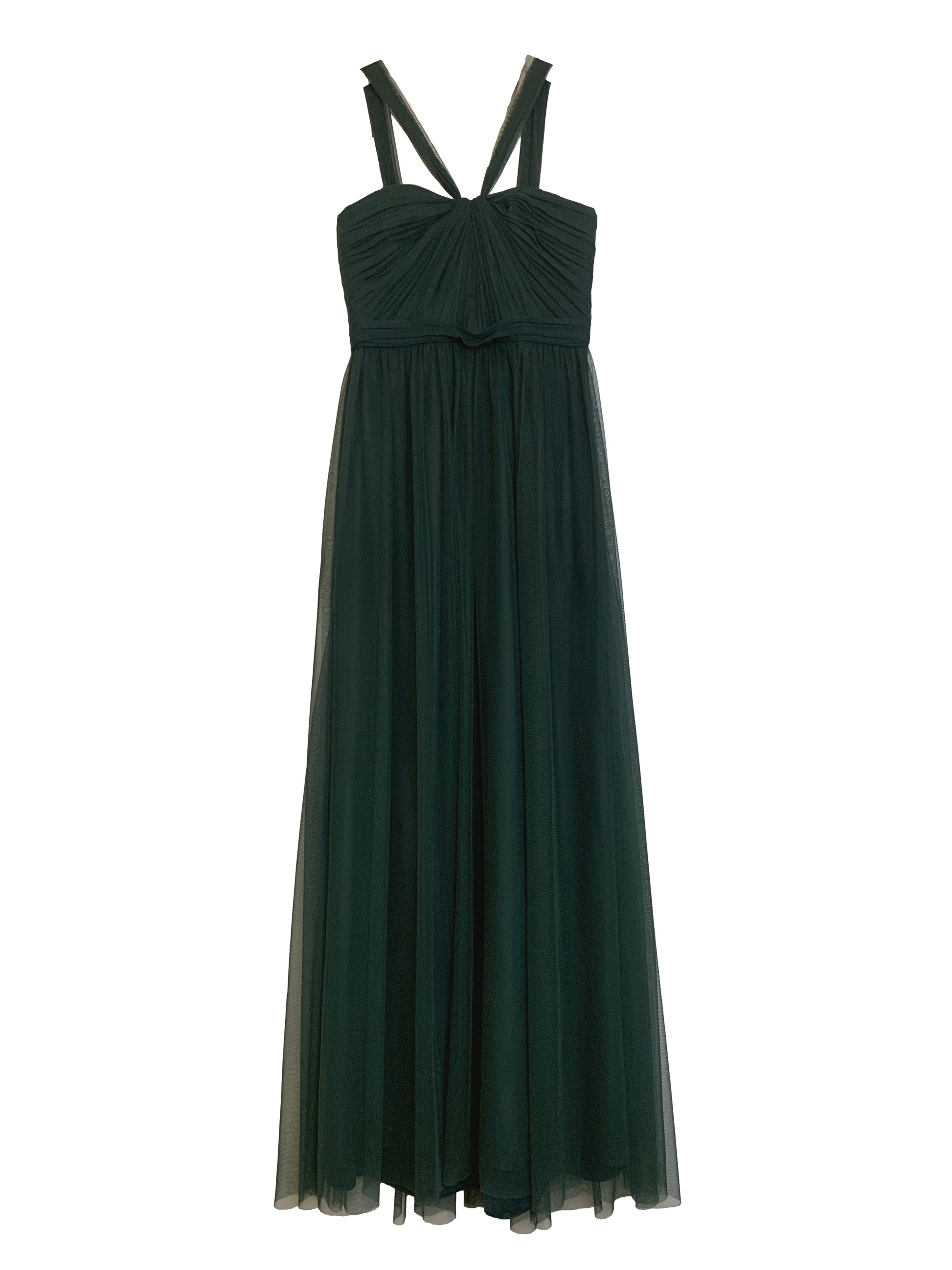 Elegant draped tulle bodice with halter straps, natural waistline with tulle belt, gathered a-line tulle skirt