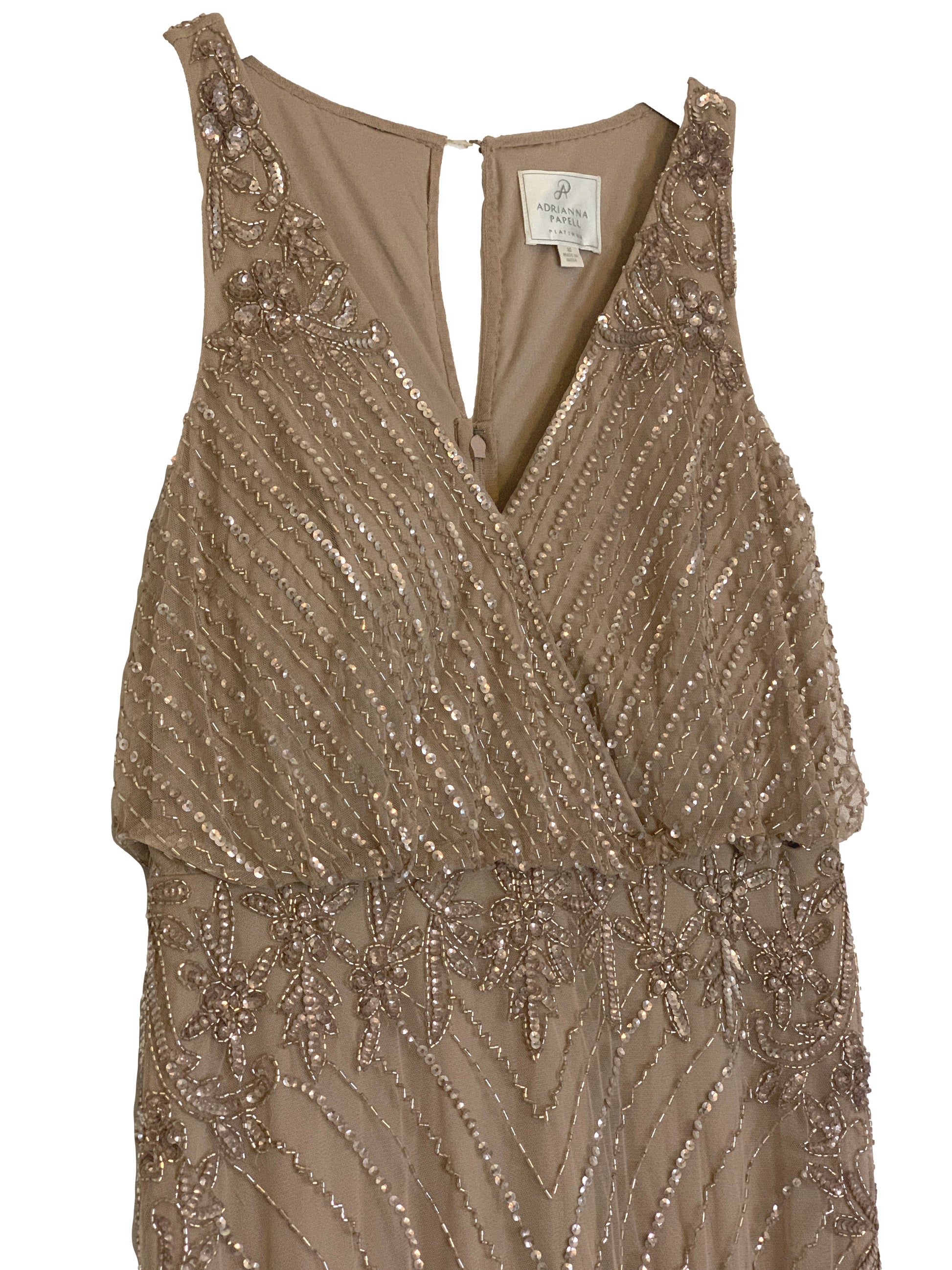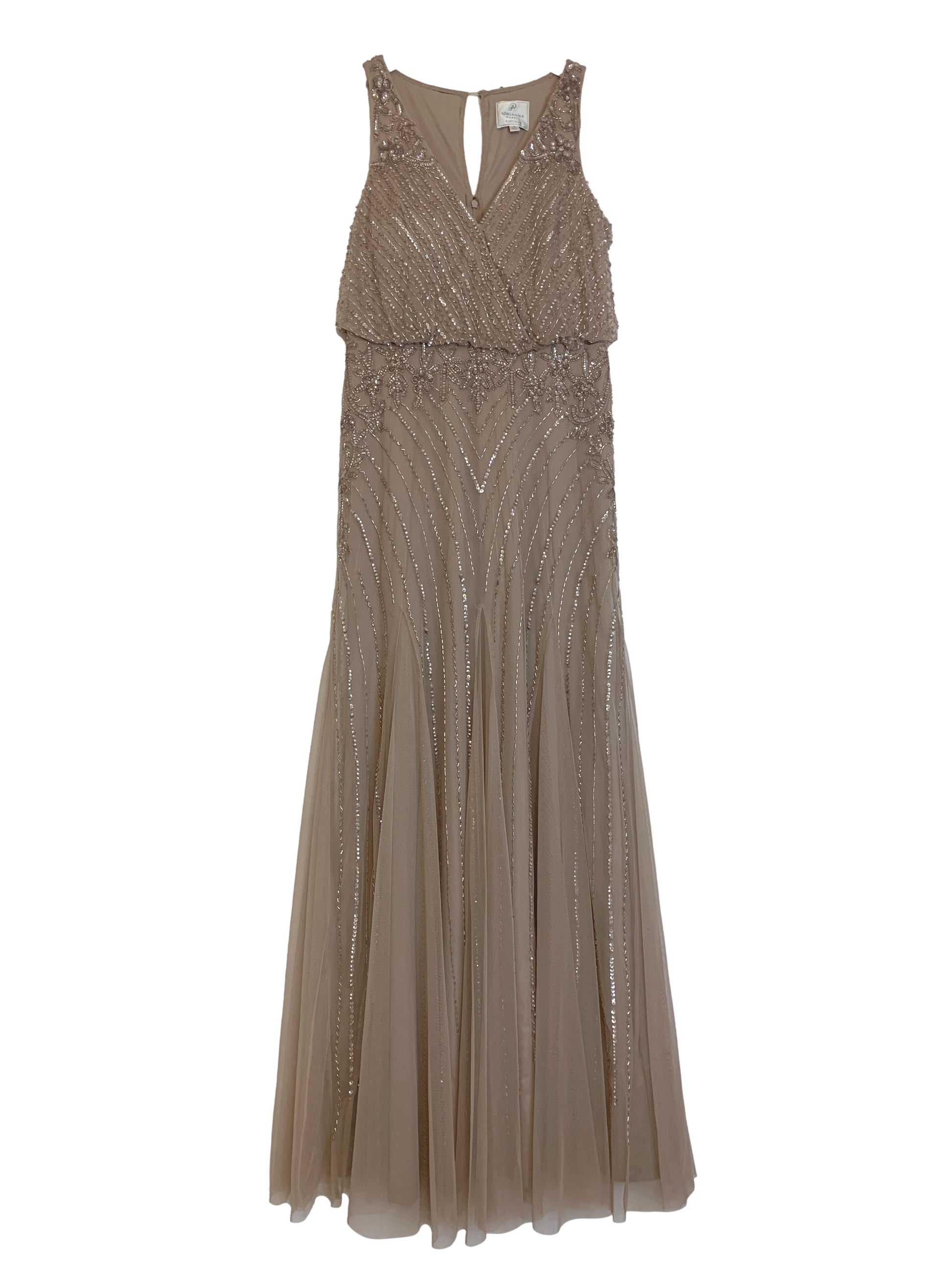 Beaded and sequin dress with floral motifs at waist and shoulder. v-neck surplice bodice with 1.25" straps, keyhole at back, blouson bodice, blouson at natural waist, mermaid skirt with godets.
