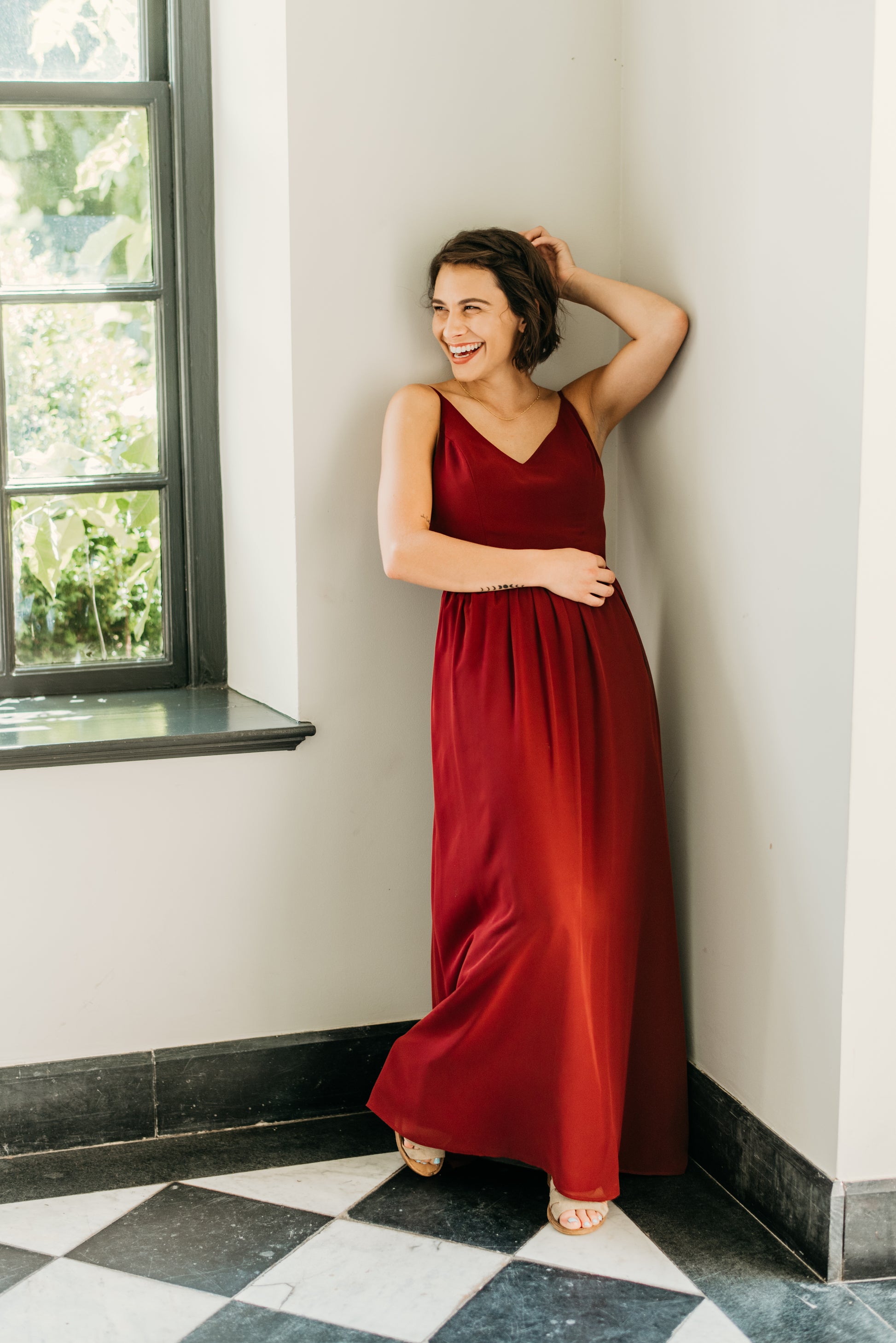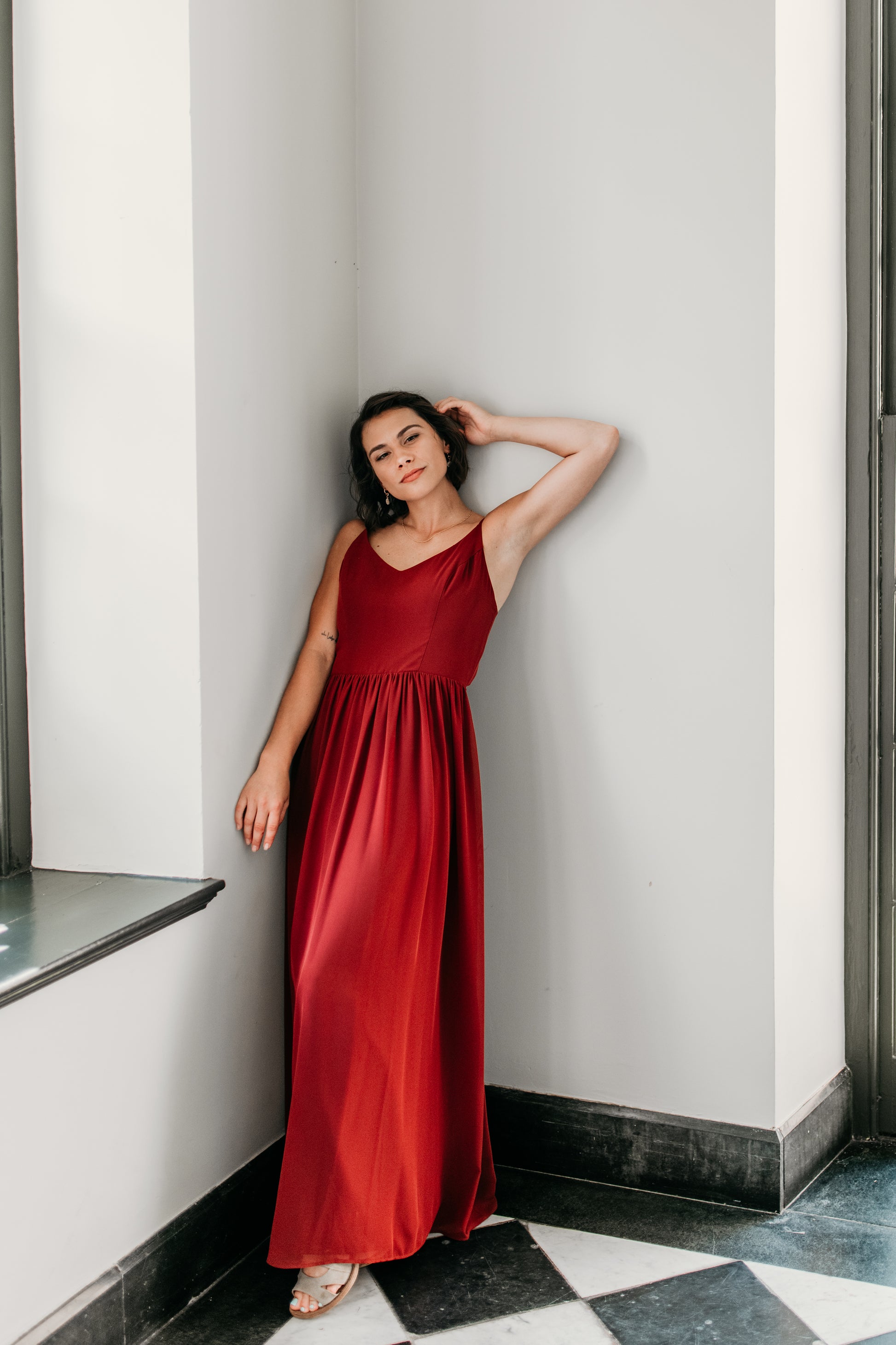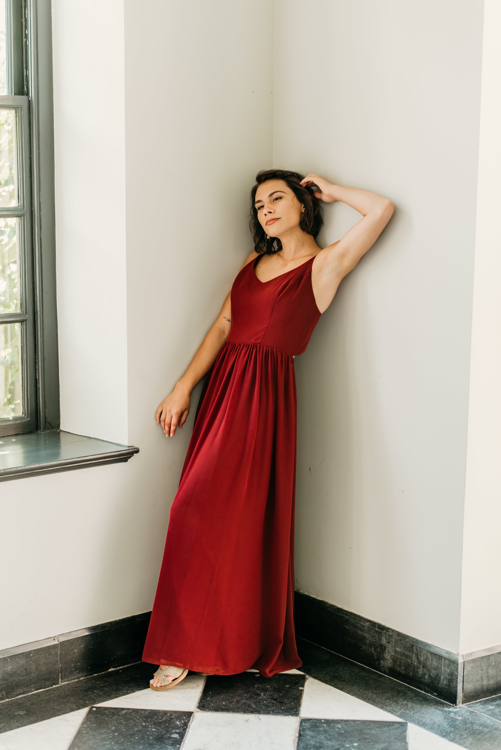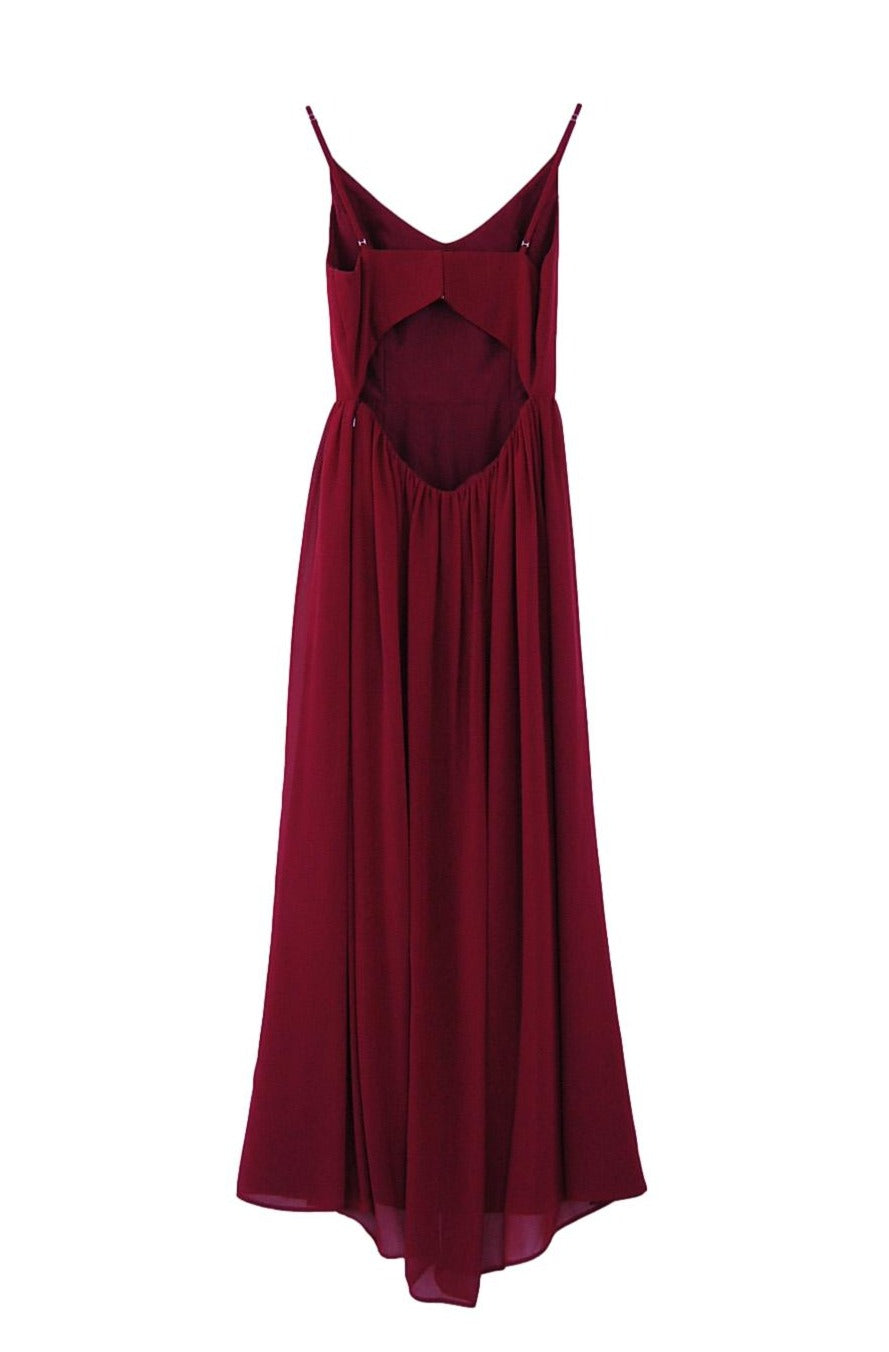 Chiffon v-neck princess seam bodice with spaghetti straps, semi-open back, gathered A-line skirt