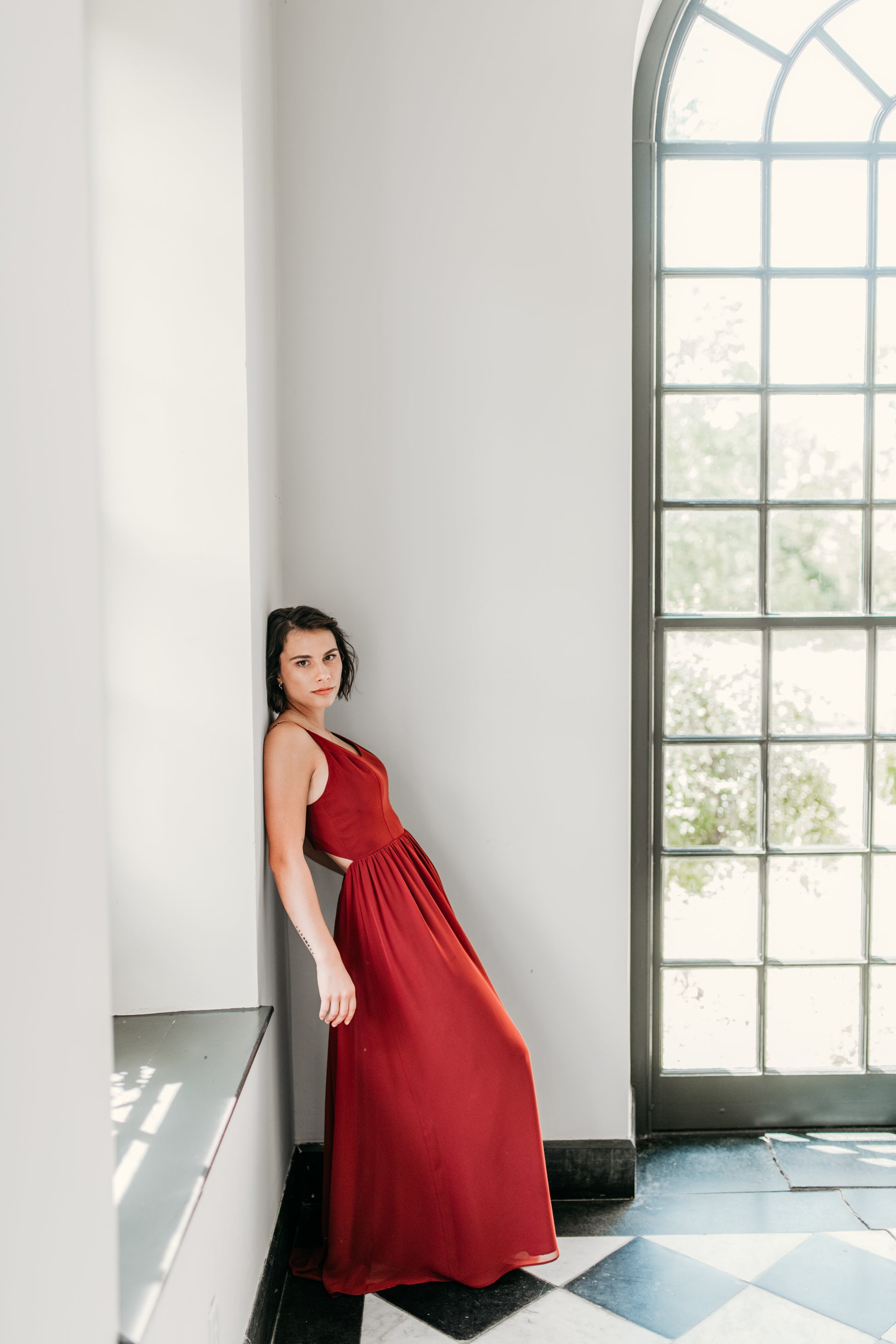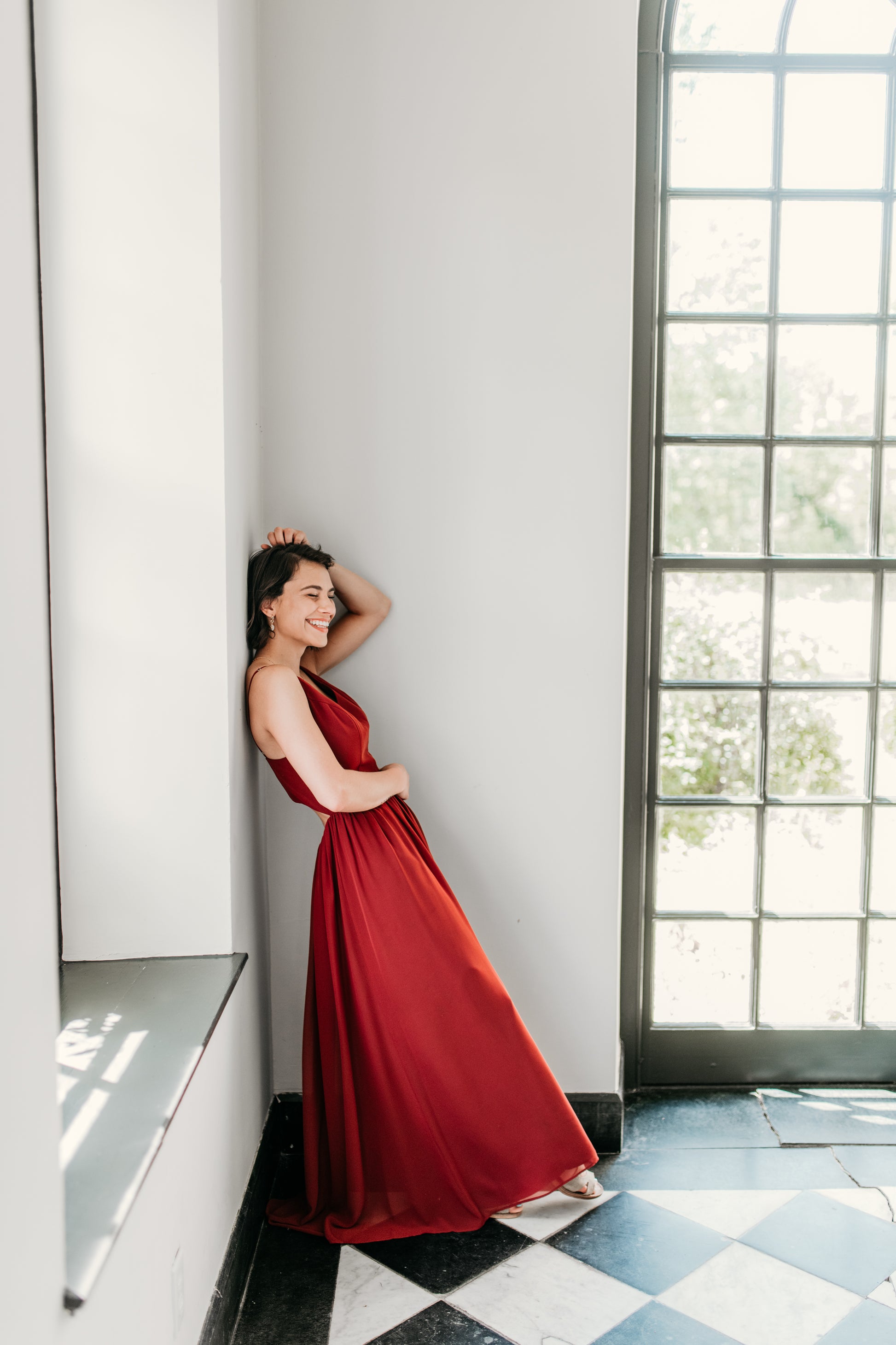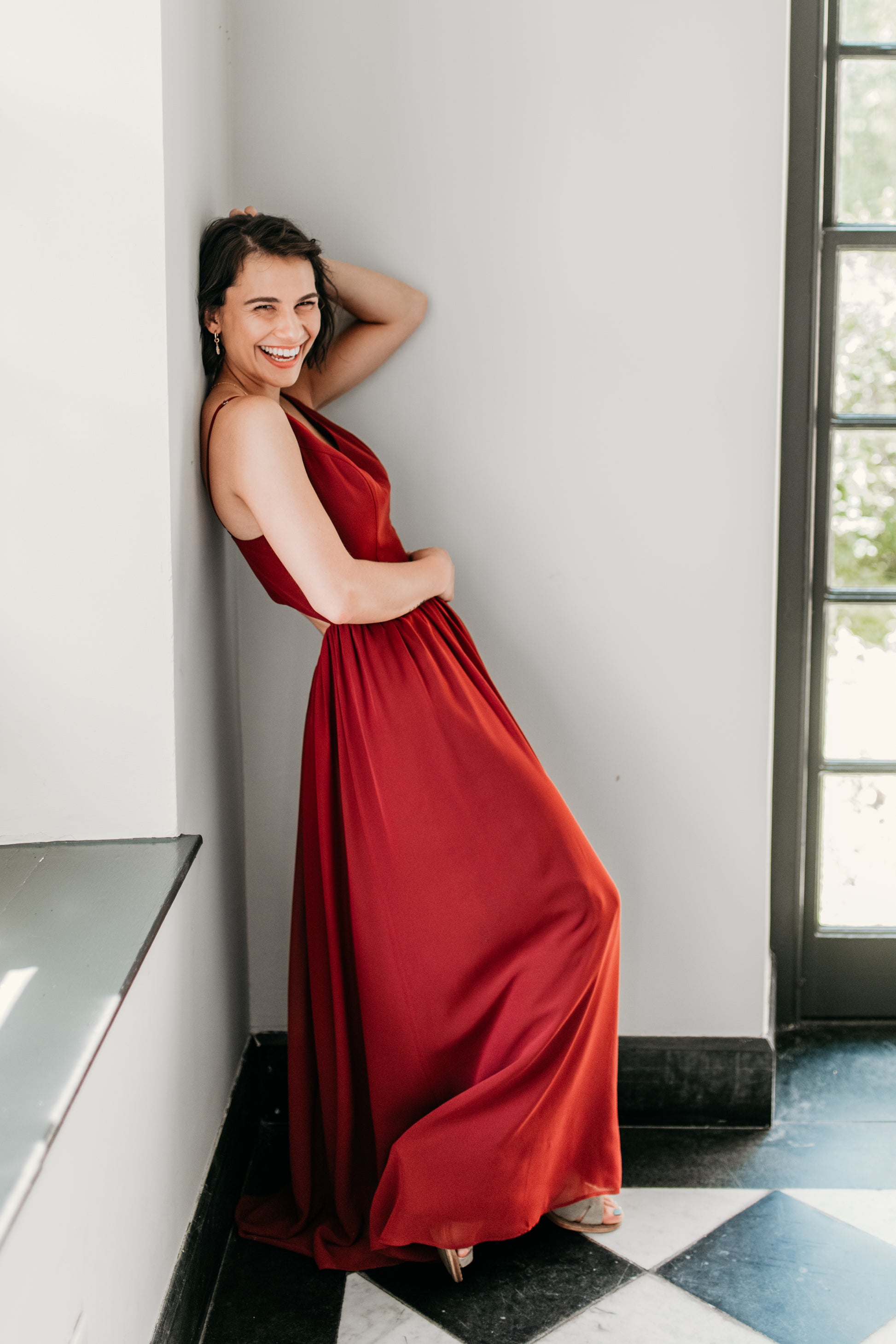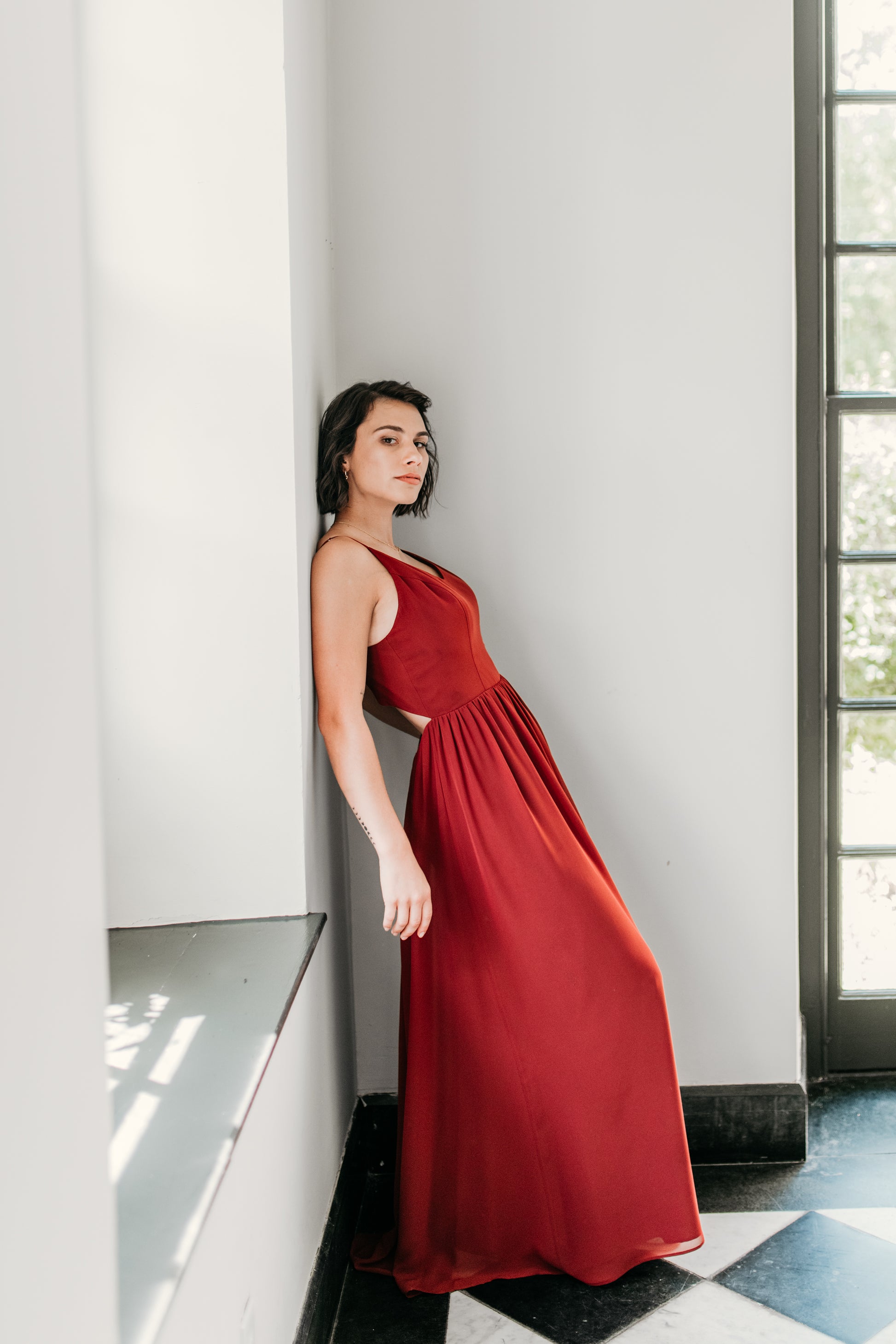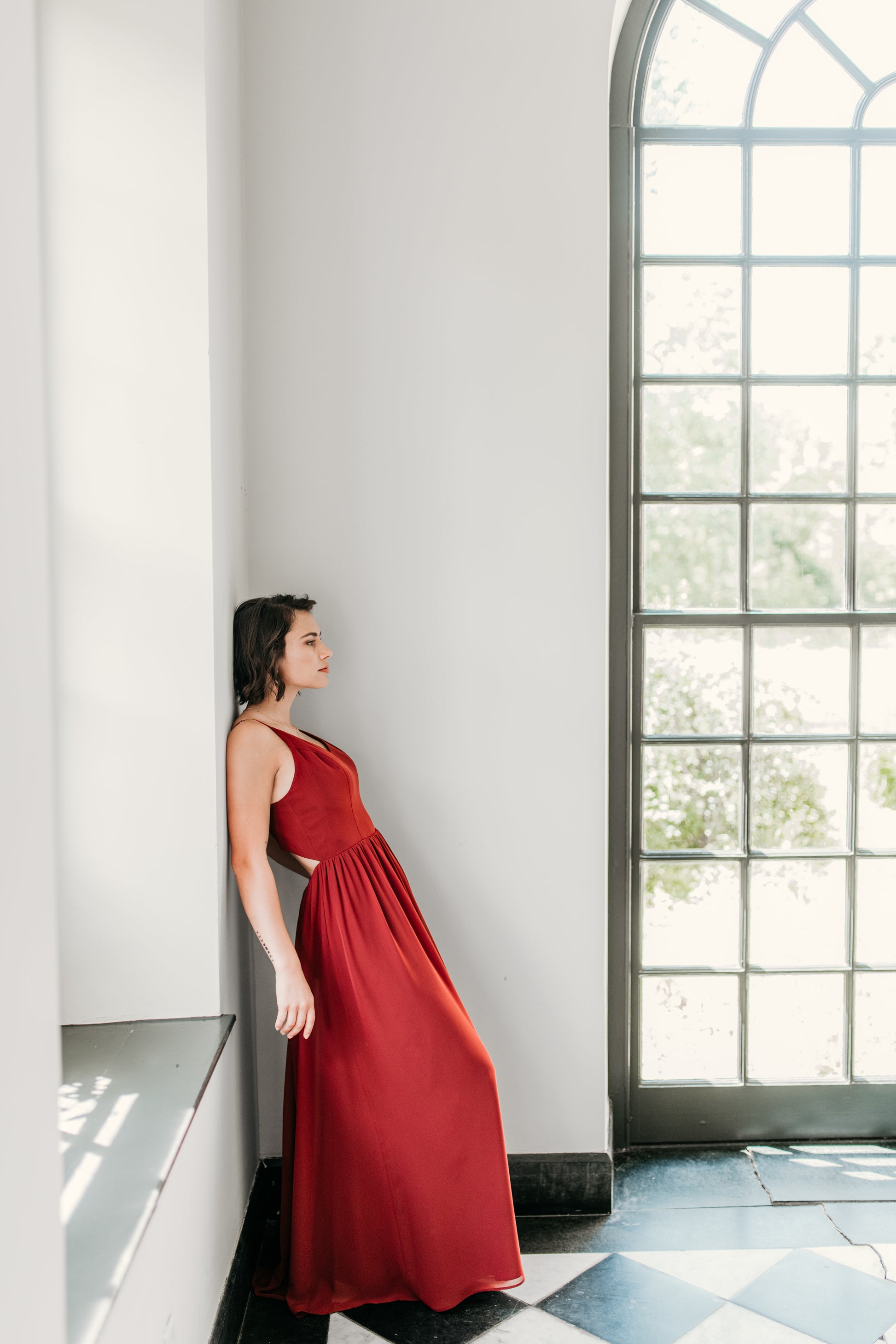 Chiffon v-neck princess seam bodice with spaghetti straps, semi-open back, gathered A-line skirt